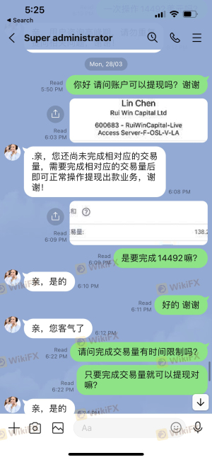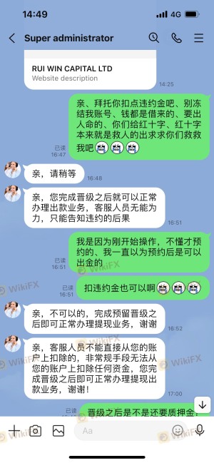 saya mulai berdagang dengan RUI WIN CAPITAL sejak Desember 2021. setelah beberapa perdagangan, saya mengkonfirmasi dengan platform untuk menarik dana. tetapi platform mengatakan bahwa pajak 15% harus dibayarkan ke platform sebelum penarikan dana dan setelah pajak selesai, penarikan akan segera diproses. saya membayar pajak dan meminta untuk menarik lagi, kemudian mereka mengatakan bahwa jumlah saya sebelumnya sebesar 380k dolar AS akan dibebankan oleh orang lain, jadi saya harus membayar dolar tambahan yaitu 30% dari 380k kami sebagai deposit jaminan, dan itu perlu untuk tinggal di sistem platform selama seminggu dan kemudian kembali ke akun saya. saya mentransfer apa yang disebut setoran gadai dan meminta penarikan lagi, pertama mereka mengatakan penarikan dana membutuhkan 1-7 hari, setelah beberapa pertanyaan, mereka mengubah bahwa saya harus menunggu 1-3 bulan untuk penarikan dana karena waktu puncak. pada saat yang sama, mereka meminta saya untuk membayar 2% dari dana saya untuk menjadi vip dan anggota vip dapat menerima dana penarikan dengan 24 jam. saya mencoba bernegosiasi dengan mereka, dan mereka mengabaikan pesan saya. mereka memblokir akun saya selama 4 hari