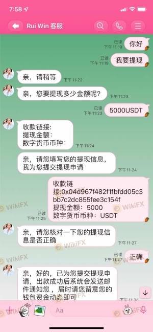 saya mulai berdagang dengan RUI WIN CAPITAL sejak Desember 2021. setelah beberapa perdagangan, saya mengkonfirmasi dengan platform untuk menarik dana. tetapi platform mengatakan bahwa pajak 15% harus dibayarkan ke platform sebelum penarikan dana dan setelah pajak selesai, penarikan akan segera diproses. saya membayar pajak dan meminta untuk menarik lagi, kemudian mereka mengatakan bahwa jumlah saya sebelumnya sebesar 380k dolar AS akan dibebankan oleh orang lain, jadi saya harus membayar dolar tambahan yaitu 30% dari 380k kami sebagai deposit jaminan, dan itu perlu untuk tinggal di sistem platform selama seminggu dan kemudian kembali ke akun saya. saya mentransfer apa yang disebut setoran gadai dan meminta penarikan lagi, pertama mereka mengatakan penarikan dana membutuhkan 1-7 hari, setelah beberapa pertanyaan, mereka mengubah bahwa saya harus menunggu 1-3 bulan untuk penarikan dana karena waktu puncak. pada saat yang sama, mereka meminta saya untuk membayar 2% dari dana saya untuk menjadi vip dan anggota vip dapat menerima dana penarikan dengan 24 jam. saya mencoba bernegosiasi dengan mereka, dan mereka mengabaikan pesan saya. mereka memblokir akun saya selama sebulan. saya sudah mengekspos kasus ini melalui wiki, tetapi mereka masih belum memberikan umpan balik.