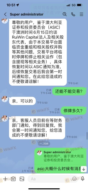 Sejak Juni, platform tidak dapat menarik dana. "Pengguna yang terhormat, mengingat Komisi Sekuritas dan Investasi Australia (ASIC) mewawancarai badan hukum RuiWin Capital dan perwakilan pemegang saham terkait pada 15 Juni waktu Australia, karena fakta bahwa platform perdagangan menghadapi restrukturisasi modal dan Untuk masalah lain seperti merger dan akuisisi ekuitas terkait, platform perdagangan akan menangguhkan sementara perdagangan dan menghentikan operasi terkait (termasuk penarikan tunai dan bisnis terkait lainnya). Waktu pemulihan spesifik tunduk pada pemberitahuan ASIC. Saya akan memberi tahu Anda sesegera mungkin setelah perdagangan berikutnya dimulai kembali. Maaf atas ketidaknyamanan ini!" Sudah lebih dari sebulan sekarang, dan sekarang saya bahkan tidak bisa menghubungi layanan pelanggan!