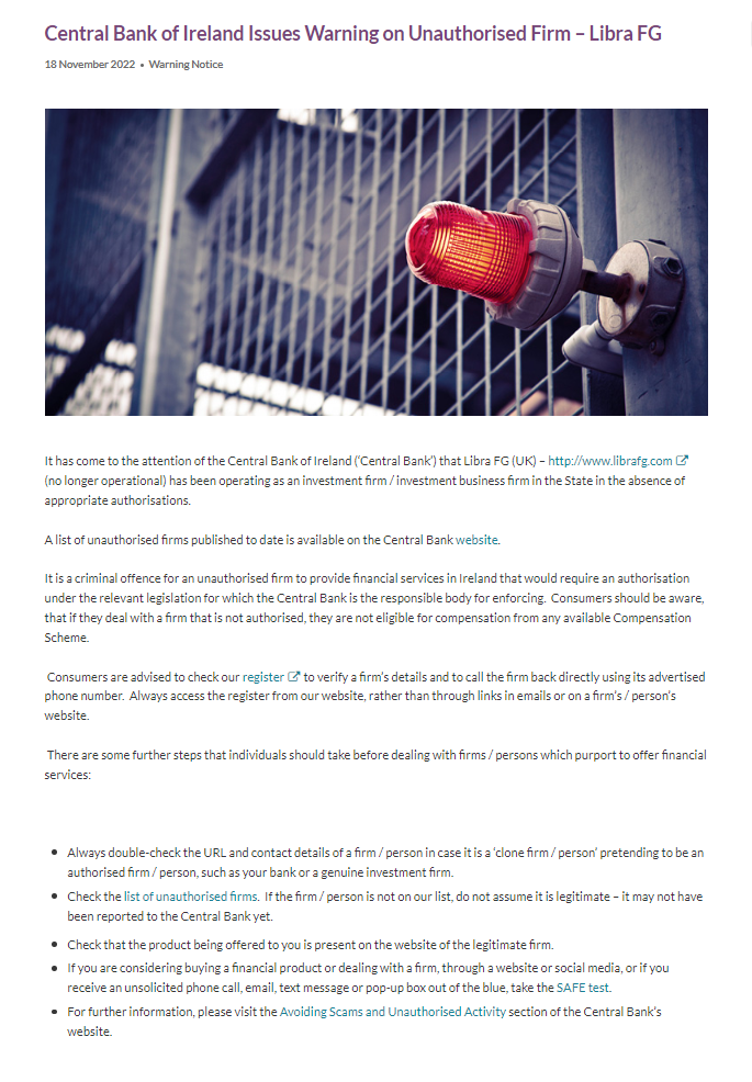 Bank Sentral Irlandia Mengeluarkan Peringatan pada Perusahaan Tidak Sah – Libra FG