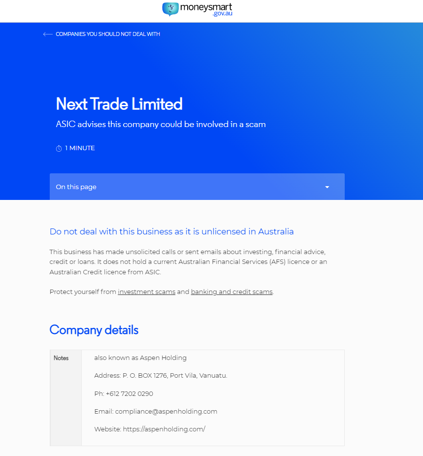 daftar peringatan investor Next Trade Limited ASIC menyarankan perusahaan ini mungkin terlibat dalam penipuan.