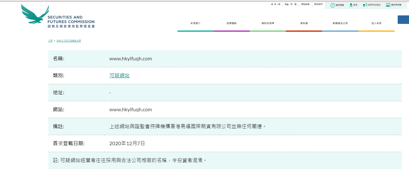 Nama: www. hkyifuqh .com Kategori: Alamat Situs Web yang Mencurigakan: - Situs web: www. hkyifuqh .com Keterangan: Situs web di atas tidak terkait dengan lembaga berlisensi dari Securities Regulatory Commission 香港易福國際期貨有限公司 Tidak terhubung dengan cara apa pun. Tanggal publikasi pertama: 7 Desember 2020 Catatan: Operator situs web yang mencurigakan sering menggunakan nama yang mirip dengan perusahaan yang sah, membingungkan investor. " Daftar Perusahaan Tanpa Izin dan Situs Web Mencurigakan mencantumkan perusahaan yang tidak memiliki izin di Hong Kong dan telah menarik perhatian SFC. Perusahaan-perusahaan ini diduga atau sedang memasarkan ke investor Hong Kong, atau mengklaim memiliki tautan ke Hong Kong. Anda dapat mencari berdasarkan nama atau kategori untuk melihat apakah perusahaan ada dalam daftar. Daftar ini tidak lengkap. Karena SFC sering menemukan perusahaan atau situs web catatan, yang baru ditambahkan ke daftar dari waktu ke waktu. Jika Anda pernah didekati oleh perusahaan tidak berlisensi, silakan gunakan formulir keluhan online kami. Untuk informasi lebih lanjut tentang ruang ketel uap, situs web penipuan, dan email phishing, silakan klik tautan yang relevan. CATATAN: Daftar perusahaan tidak berlisensi dan situs web mencurigakan dimaksudkan Untuk mengeluarkan peringatan dini kepada investor. Investor tidak dapat hanya mengandalkan informasi dalam daftar di atas, mereka perlu memeriksa detail masing-masing perusahaan dengan cermat. Silakan pilih huruf bahasa Inggris pertama dari nama setiap kolom untuk melihat daftar, atau klik "Nama Cina" kolom menelusuri perusahaan dengan nama China saja."