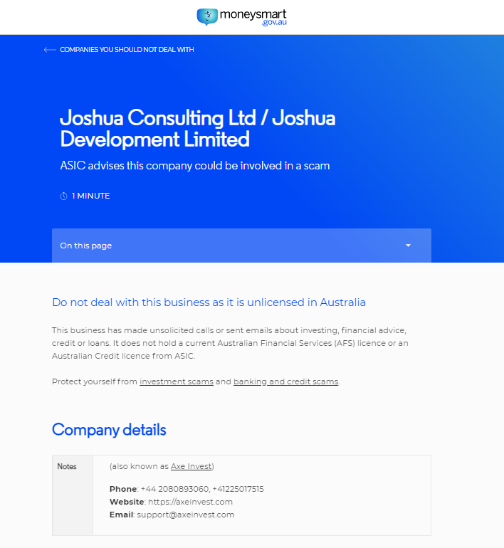 joshua counseling ltd / joshua development limited asic menyarankan perusahaan ini mungkin terlibat dalam penipuan waktu membaca halaman: 1 menit di halaman ini jangan berurusan dengan bisnis ini karena tidak berlisensi di australia bisnis ini telah melakukan panggilan yang tidak diminta atau mengirim email tentang investasi, nasihat keuangan, kredit atau pinjaman. ia tidak memegang lisensi layanan keuangan Australia (AFS) atau lisensi kredit Australia dari ASIC. lindungi diri Anda dari penipuan investasi dan penipuan perbankan dan kredit. catatan detail perusahaan (juga dikenal sebagai ax invest) telepon: +44 2080893060, +41225017515 situs web: https:// Axeinvest email .com: dukungan@ Axeinvest .com