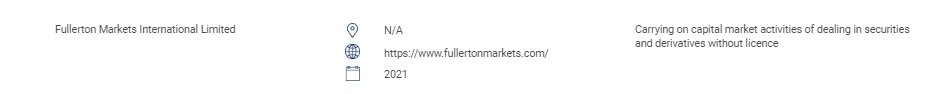 "Bagian ini berisi daftar situs web, produk investasi, perusahaan, dan individu yang tidak sah. Daftar ini mencakup: orang-orang yang melakukan atau menahan diri untuk melakukan aktivitas yang diatur berikut ini tanpa izin dari sc: transaksi sekuritas; transaksi derivatif; pengelolaan dana; memberi nasihat mengenai keuangan perusahaan; nasihat investasi; perencanaan keuangan; dan menangani skema pensiun swasta. orang yang mengoperasikan pasar yang diakui tanpa izin. orang yang menerbitkan atau menawarkan sekuritas tanpa persetujuan, izin atau pengakuan. orang yang menyalahgunakan logo sc dan salah menggambarkan sc. " Fullerton Markets International Limited tidak ada https://www. FULLERTON market.com/ 2021 menjalankan kegiatan pasar modal yang memperdagangkan sekuritas dan derivatif tanpa izin