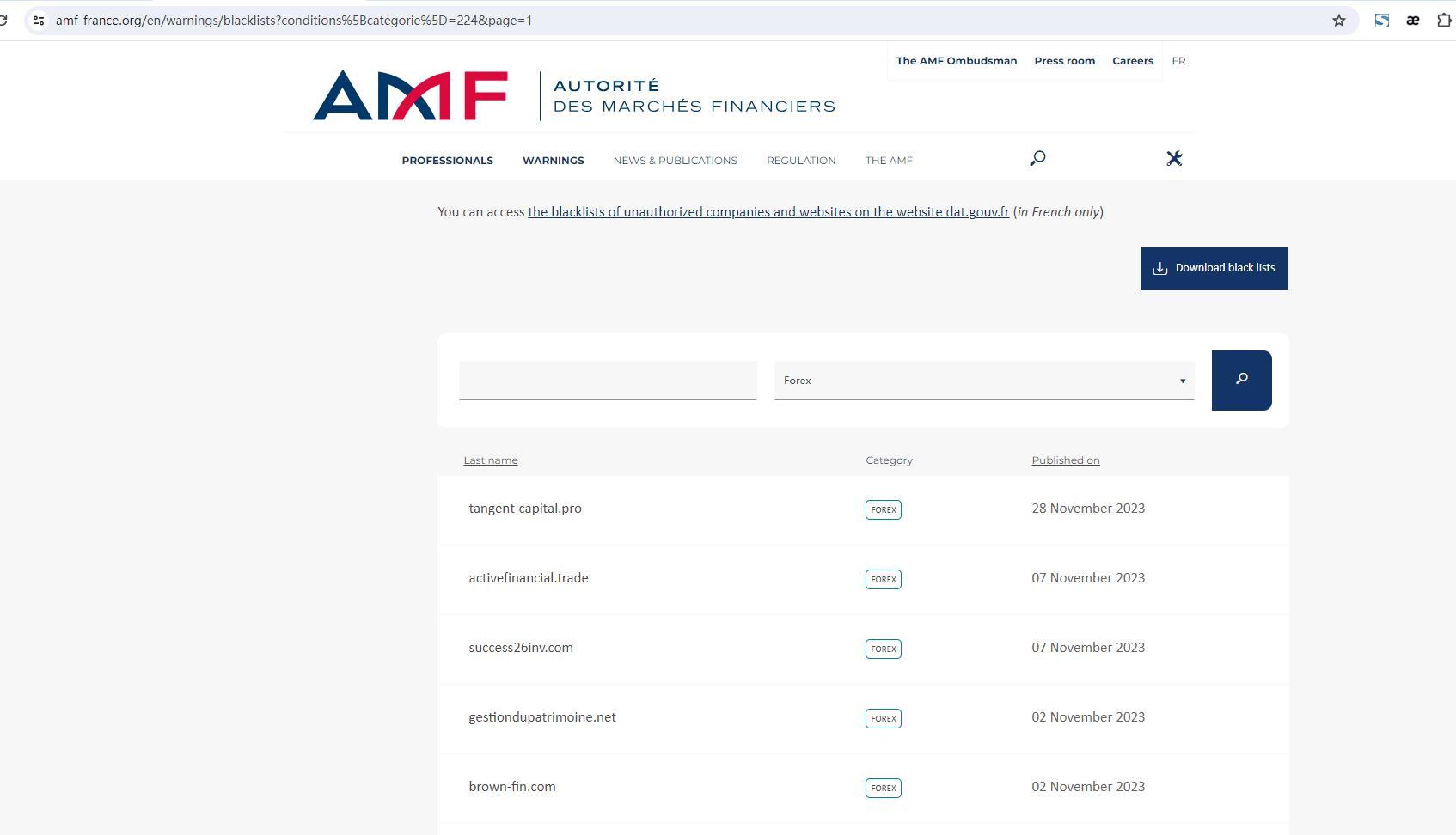 Ini adalah daftar perusahaan atau situs web yang masuk daftar hitam Autorité des Marchés Financiers (AMF), peringatan dan/atau perampasan perusahaan yang diatur.