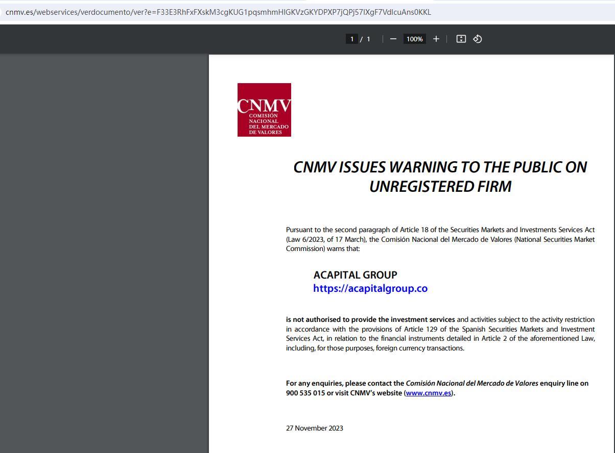 cnmv mengeluarkan peringatan kepada publik tentang perusahaan yang tidak terdaftar sesuai dengan paragraf kedua pasal 18 undang-undang pasar sekuritas dan layanan investasi (undang-undang 6/2023, tanggal 17 Maret), comisión nacional del mercado de valores (komisi pasar sekuritas nasional) memperingatkan itu: grup modal https:// AcapitalGroup .co tidak berwenang untuk menyediakan layanan dan aktivitas investasi yang tunduk pada pembatasan aktivitas sesuai dengan ketentuan pasal 129 undang-undang pasar sekuritas dan layanan investasi Spanyol, sehubungan dengan instrumen keuangan yang dirinci dalam pasal 2 undang-undang tersebut di atas, termasuk, untuk tujuan tersebut, transaksi mata uang asing. untuk pertanyaan apa pun, silakan hubungi saluran pertanyaan comisión nacional del mercado de valores di 900 535 015 atau kunjungi situs web cnmv (www.cnmv.es). 27 November 2023