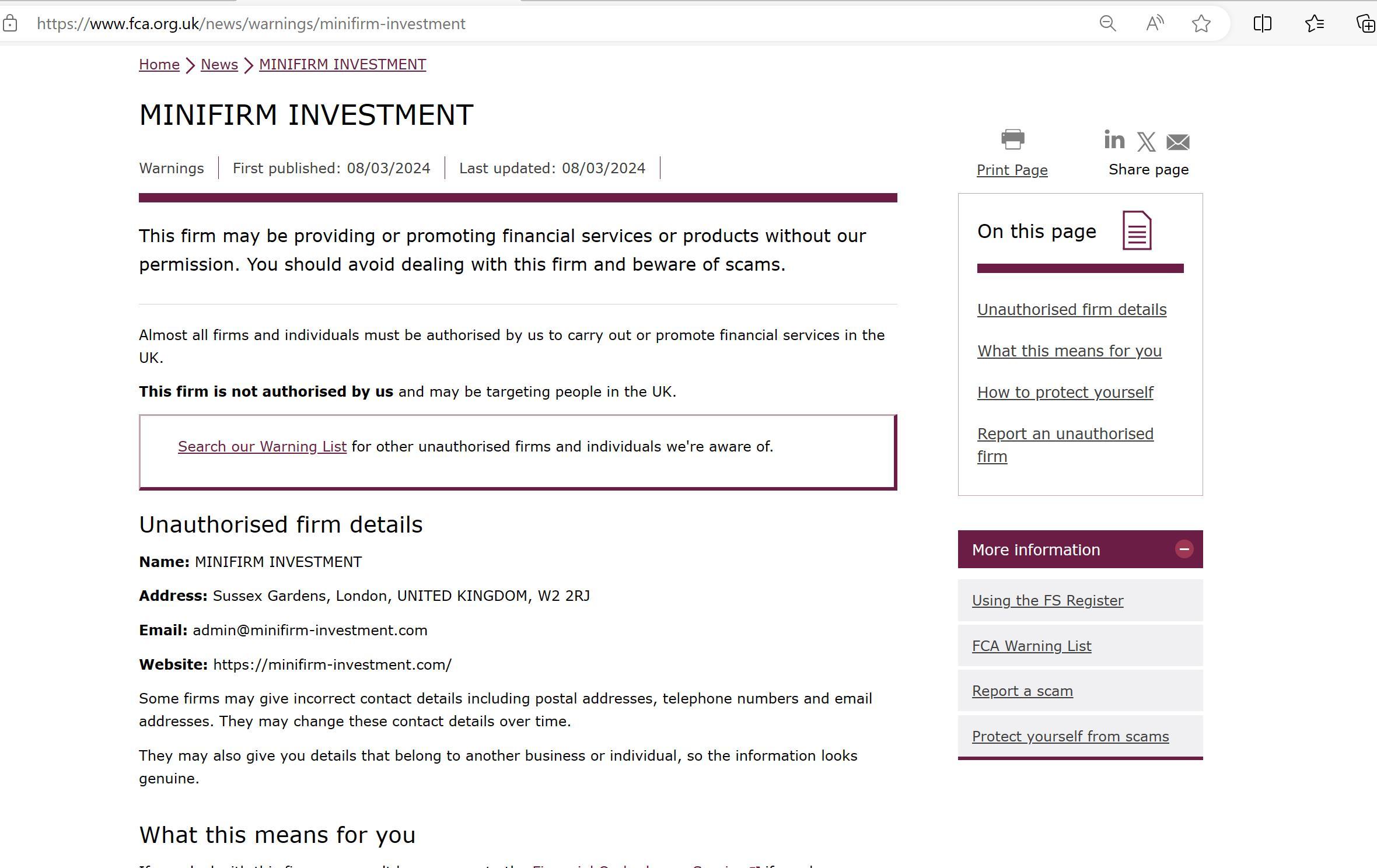 Daftar Peringatan FCA mengenai perusahaan tidak berwenang MINIFIRM INVESTMENT.