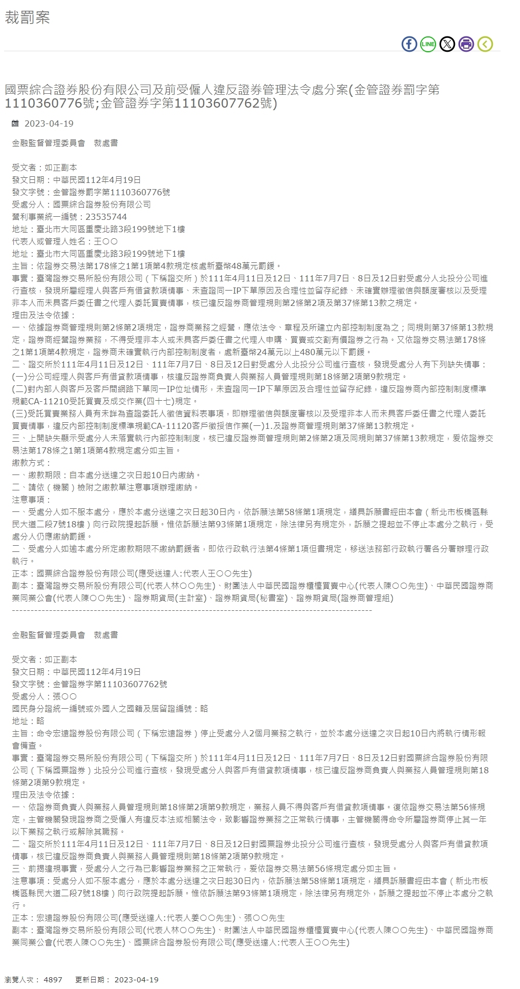 Penerima tindakan disiplin Komisi Pengawas Keuangan: Salinan asli Tanggal penerbitan: 19 April 2012 Nomor penerbitan: Hukuman Sekuritas Pengelolaan Keuangan No. 1110360776 Orang yang dihukum: IBF Securities Jumlah terpadu perusahaan yang menghasilkan keuntungan dari perusahaan saham gabungan: 23535744 Alamat: Lantai 1, B1, No. 199, Bagian 3, Jalan Utara Chongqing, Distrik Datong, Kota Taipei Nama Perwakilan atau Manajer: Wang ○○ Alamat: B1, 199, Bagian 3, Jalan Utara Chongqing, Distrik Datong, Kota Taipei Tujuan: Denda sebesar NT$480.000 dikenakan sesuai dengan Pasal 178-1, Ayat 1, Ayat 4 Undang-Undang Sekuritas dan Bursa. Fakta: Taiwan Stock Exchange Co., Ltd. (selanjutnya disebut Bursa Efek) melakukan inspeksi di Cabang Beitou terhadap orang yang dihukum pada tanggal 11 dan 12 April 2011, serta 7, 8 dan 12 Juli 2011. Diketahui bahwa manajer dan pelanggan telah meminjam uang, gagal memverifikasi alasan dan rasionalitas pesanan yang dilakukan oleh IP yang sama dan menyimpan catatan, gagal melakukan peninjauan kredit dan batas secara akurat, dan menerima transaksi yang dipercayakan oleh agen yang bukan diri mereka sendiri. dan tidak mempunyai surat kuasa dari nasabah, terbukti melanggar ketentuan Pasal 2 Ayat 2 dan Pasal 37 Ayat 13 Peraturan Pengelolaan Perantara Pedagang Efek. Alasan dan dasar hukum : 1. Menurut ketentuan Pasal 2 Ayat 2 Peraturan Pengurusan Perantara Pedagang Efek, usaha perusahaan efek dilaksanakan menurut peraturan perundang-undangan, anggaran dasar dan sistem pengendalian intern yang telah ditetapkan; ketentuan yang sama Pasal 37 Ayat 13 Peraturan, Perusahaan Efek yang bergerak di bidang usaha efek tidak boleh menerima pemesanan, pembelian, penjualan atau penyerahan efek oleh orang lain selain dirinya atau oleh agen yang tidak mempunyai surat penunjukan dari nasabah. Menurut ketentuan Pasal 178-1, Ayat 1, Ayat 4 Undang-Undang Sekuritas dan Bursa, perusahaan sekuritas yang gagal menerapkan sistem pengendalian internal akan didenda tidak kurang dari NT$240,000 tetapi tidak lebih dari NT$4,8 juta. 2. Bursa Efek melakukan pemeriksaan di Cabang Beitou terhadap orang yang dihukum pada tanggal 11 dan 12 April, serta 7, 8, dan 12 Juli 2011, dan menemukan bahwa orang yang dihukum memiliki kekurangan sebagai berikut: (1) ) Pimpinan cabang mempunyai pinjaman dengan nasabah yang melanggar ketentuan Pasal 18 Angka 2 Angka 9 Peraturan Kepengurusan Penanggung Jawab dan Tenaga Usaha Pedagang Efek. (2) Gagal memverifikasi alasan dan rasionalitas pesanan yang dilakukan dengan alamat IP yang sama dan menyimpan catatan jika orang dalam melakukan pemesanan online dengan pelanggan dan antar pelanggan, melanggar spesifikasi standar ca-11210 sistem pengendalian internal perusahaan sekuritas, peraturan penugasan perdagangan dan transaksi (47). (3) Pelaku usaha perdagangan titipan gagal memverifikasi lembar informasi kredit klien secara rinci, yaitu menangani laporan kredit dan peninjauan limit, serta menerima transaksi titipan dari agen yang bukan dirinya dan tidak memiliki surat penunjukan klien. yang melanggar standar dan peraturan sistem pengendalian internal ca -11120 Operasi Penagihan Kredit Nasabah (1) 1. dan ketentuan Pasal 37 Ayat 13 Peraturan Pengelolaan Perantara Pedagang Efek. 3. Kekurangan-kekurangan tersebut di atas menunjukkan bahwa yang dihukum telah gagal melaksanakan sistem pengendalian intern dan melanggar Pasal 2 Ayat 2 Peraturan Pengelolaan Perantara Pedagang Efek dan Pasal 37 Ayat 13 peraturan yang sama, sesuai dengan Pasal 178-1 Undang-Undang Sekuritas dan Bursa Paragraf 1 ayat 4 mengatur bahwa hukumannya harus sesuai dengan keinginannya. Metode pembayaran: 1. Batas waktu pembayaran: Bayar dalam waktu 10 hari sejak sanksi ini diberikan. 2. Mohon melakukan pembayaran sesuai dengan ketentuan pada slip pembayaran yang dilampirkan pada (agensi). Catatan: 1. Jika orang yang dikenakan hukuman tidak puas dengan hukuman ini, ia harus mengajukan petisi melalui Asosiasi ini (Distrik Banqiao, Kota New Taipei) sesuai dengan ketentuan Pasal 58 Ayat 1 Undang-Undang Petisi dalam waktu 30 hari sejak hari setelah hukuman dijalani. Lantai 18, No. 7, Bagian 2, Jalan Xianmin) mengajukan petisi ke Eksekutif Yuan. Namun menurut Pasal 93 Ayat 1 UU Permohonan, kecuali ditentukan lain oleh undang-undang, pengajuan banding tidak menghentikan pelaksanaan sanksi tersebut, dan yang dikenakan sanksi tetap membayar denda. 2. Jika orang yang dikenai hukuman tidak membayar denda dalam jangka waktu pembayaran yang ditentukan dalam hukuman ini, orang tersebut akan dipindahkan ke cabang Badan Penegakan Administratif Kementerian Kehakiman untuk penegakan administratif sesuai dengan ketentuan Pasal 4, Paragraf 1 Undang-Undang Penegakan Administratif. asli: IBF Securities Co., Ltd. (Untuk dilayani: Perwakilan: Tuan Wang ○○) Salinan: Taiwan Stock Exchange Co., Ltd. (Perwakilan: Tuan Lin ○○), Pusat Perdagangan Sekuritas Over-the-counter Republik Tiongkok (Perwakilan: Tuan Chen ○○ ), Asosiasi Bisnis Sekuritas Republik Tiongkok (perwakilan Tuan Chen ○○), Biro Sekuritas dan Berjangka (Kantor Akuntansi), Biro Sekuritas dan Berjangka (Kantor Sekretaris), Biro Sekuritas dan Berjangka (Grup Manajemen Sekuritas) -------- ------------------------------------- ---------------------------- ------------------------------------- -- Penerima keputusan Komisi Pengawas Keuangan: jika Tanggal penerbitan asli dan salinan: 19 April 2012, Republik Tiongkok Nomor penerbitan: Surat Berharga Pengelolaan Keuangan No. 11103607762 Orang yang akan dihukum: Zhang ○○ Kartu identitas nasional terpadu nomor atau nomor kewarganegaraan dan izin tinggal orang asing: dihilangkan alamat: dihilangkan subjek: dihilangkan Perintah Hongyuan Securities Co., Ltd. (selanjutnya disebut Hongyuan Securities) untuk menghentikan pelaksanaan bisnis orang yang dihukum selama dua bulan, dan melaporkan status eksekusi ke rapat untuk ditinjau dalam waktu 10 hari sejak hari setelah hukuman dijatuhkan. Fakta: Taiwan Stock Exchange Co., Ltd. 