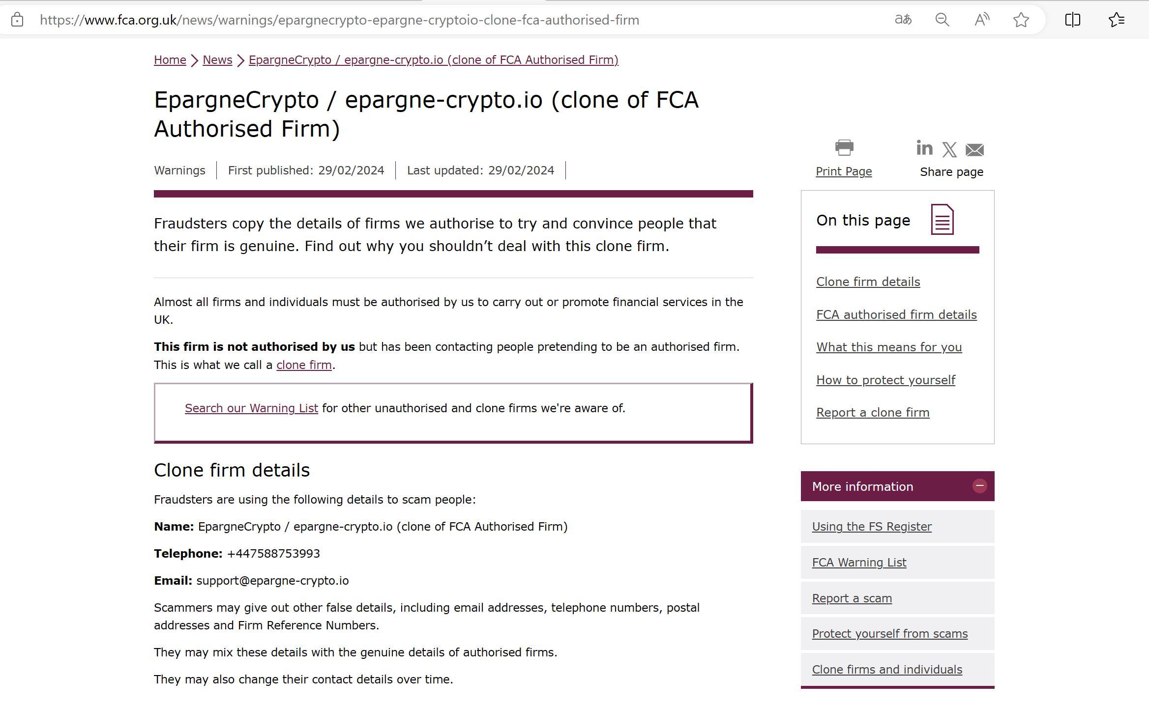 Daftar Peringatan FCA mengenai perusahaan tidak berwenang EpargneCrypto.