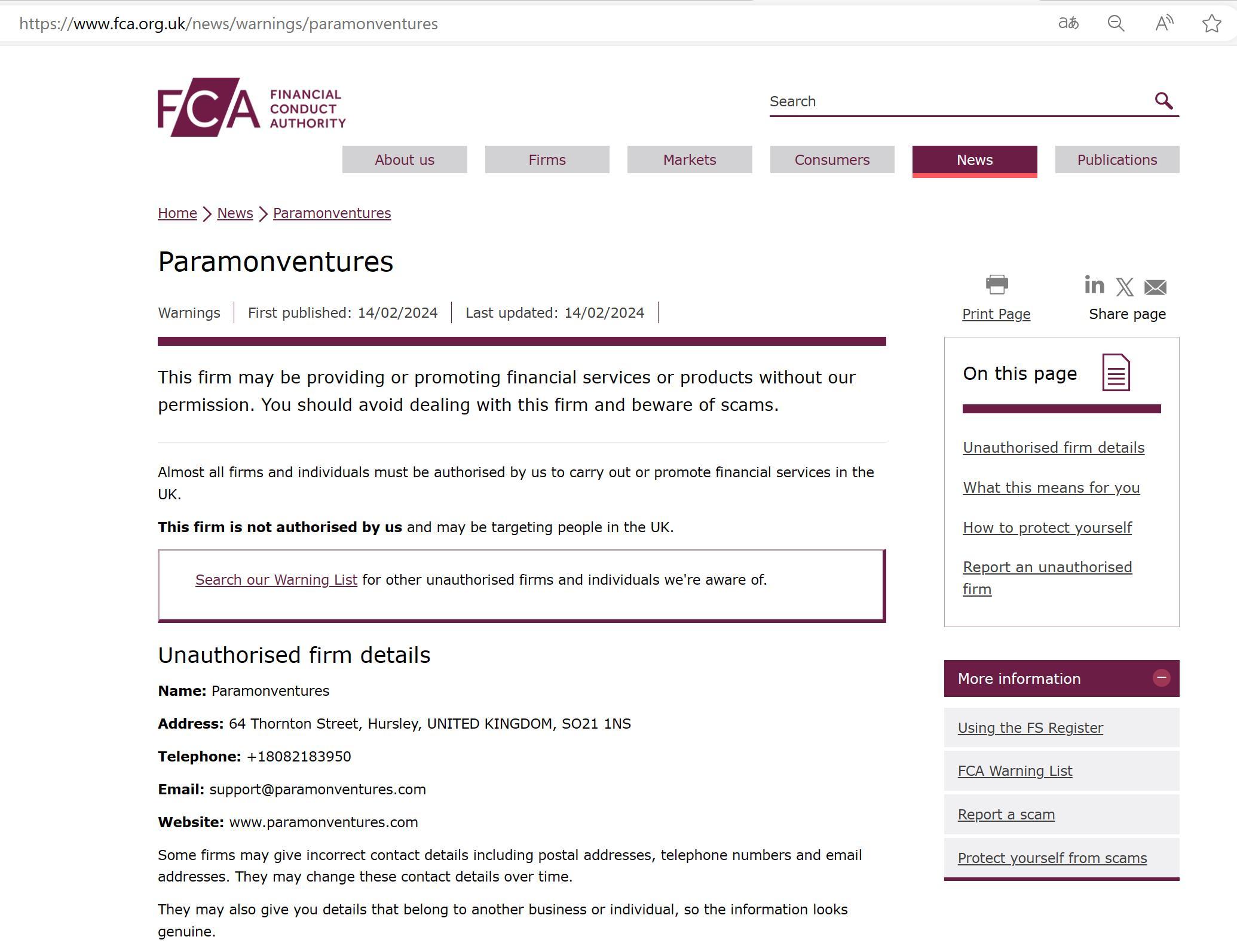 Daftar Peringatan FCA mengenai perusahaan tidak berwenang Paramonventures.