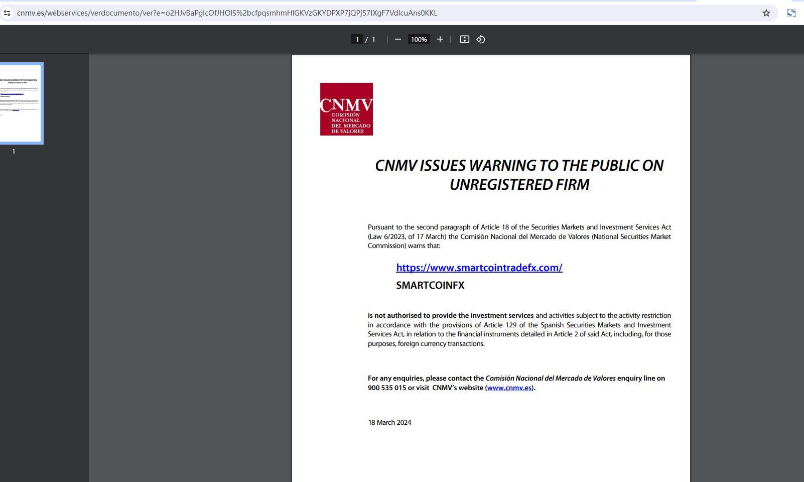 CNMV MENGELUARKAN PERINGATAN KEPADA PUBLIK TERHADAP PERUSAHAAN YANG TIDAK TERDAFTAR Berdasarkan paragraf kedua Pasal 18 Undang-Undang Pasar Sekuritas dan Jasa Investasi (UU 6/2023, tanggal 17 Maret), Comisión Nacional del Mercado de Valores (Komisi Pasar Sekuritas Nasional) memperingatkan bahwa : https://www.smartcointradefx.com/ SMARTCOINFX tidak berwenang untuk menyediakan layanan dan aktivitas investasi yang tunduk pada pembatasan aktivitas sesuai dengan ketentuan Pasal 129 Undang-Undang Pasar Sekuritas dan Layanan Investasi Spanyol, sehubungan dengan keuangan instrumen yang dirinci dalam Pasal 2 Undang-undang tersebut, termasuk, untuk tujuan tersebut, transaksi mata uang asing. Untuk pertanyaan apa pun, silakan hubungi saluran pertanyaan Comisión Nacional del Mercado de Valores di 900 535 015 atau kunjungi situs web CNMV (www.cnmv.es). 18 Maret 2024