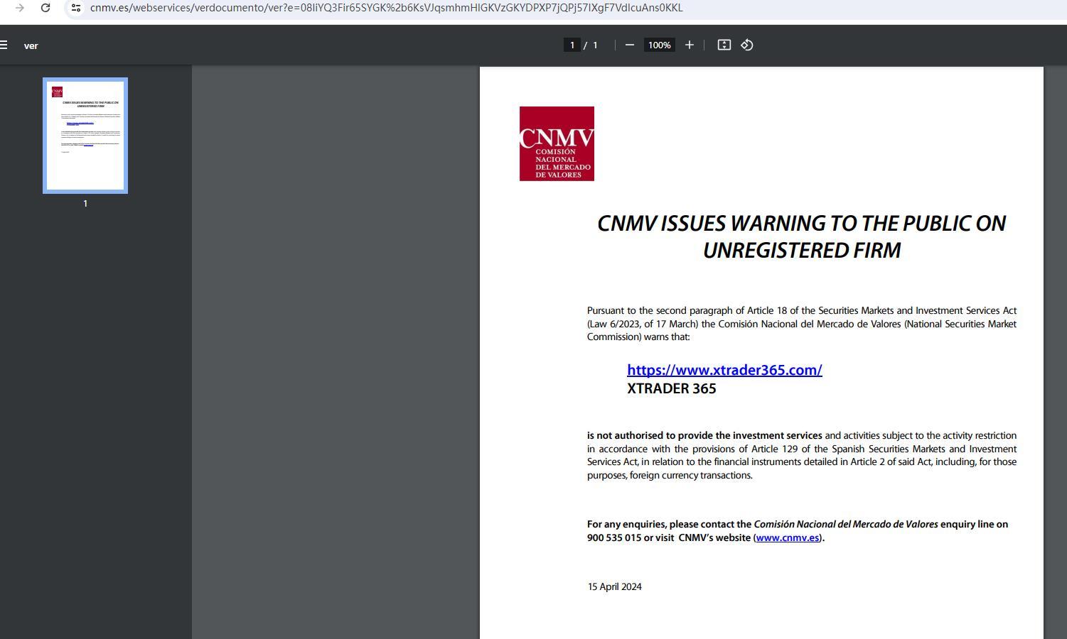 cnmv mengeluarkan peringatan kepada publik tentang perusahaan yang tidak terdaftar sesuai dengan paragraf kedua pasal 18 undang-undang pasar sekuritas dan layanan investasi (undang-undang 6/2023, tanggal 17 Maret), comisión nacional del mercado de valores (komisi pasar sekuritas nasional) memperingatkan bahwa : https://www. Xtrader365 .com/ xtrader 365 tidak berwenang untuk menyediakan layanan dan aktivitas investasi yang tunduk pada pembatasan aktivitas sesuai dengan ketentuan pasal 129 undang-undang pasar sekuritas dan layanan investasi Spanyol, sehubungan dengan instrumen keuangan yang dirinci dalam pasal 2 tersebut bertindak, termasuk, untuk tujuan tersebut, transaksi mata uang asing. untuk pertanyaan apa pun, silakan hubungi saluran pertanyaan comisión nacional del mercado de valores di 900 535 015 atau kunjungi situs web cnmv (www.cnmv.es). 15 April 2024