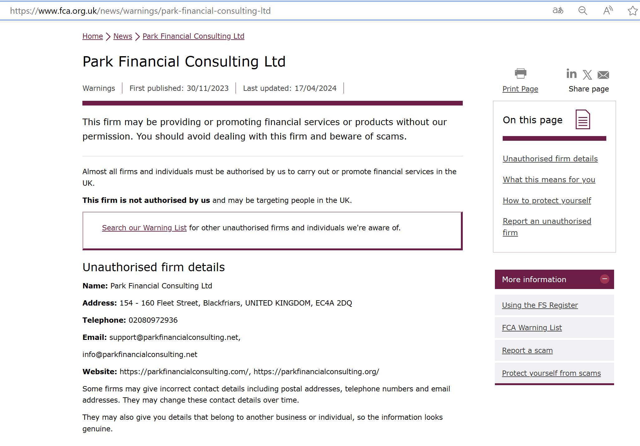 Daftar Peringatan FCA mengenai perusahaan tidak berwenang Park Financial Consulting Ltd.