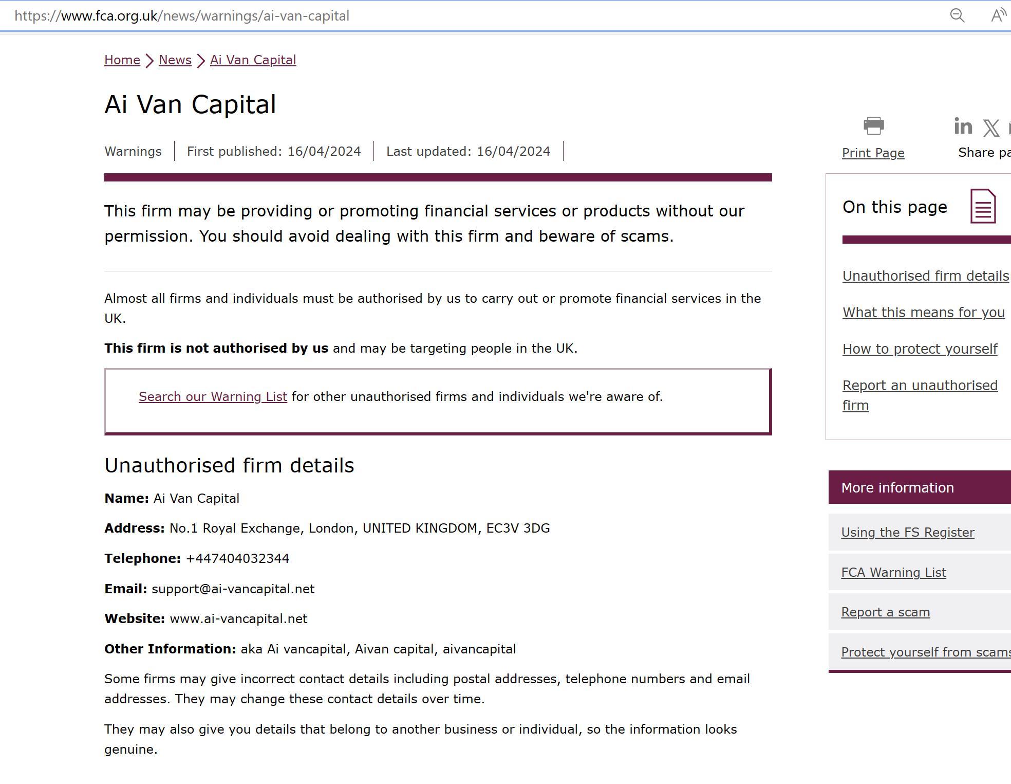 Daftar Peringatan FCA mengenai perusahaan yang tidak berwenang Ai Van Capital.