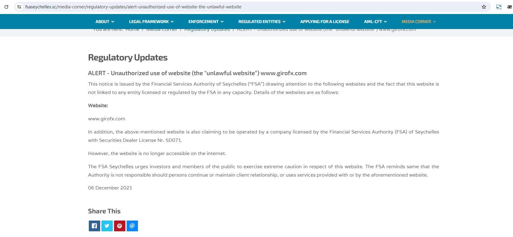 peringatan pembaruan peraturan - penggunaan situs web yang tidak sah (“situs web yang melanggar hukum”) www. GiroFX .com pemberitahuan ini dikeluarkan oleh otoritas jasa keuangan seychelles (“fsa”) dengan menarik perhatian ke situs web berikut dan fakta bahwa situs web ini tidak terhubung dengan entitas mana pun yang dilisensikan atau diatur oleh fsa dalam kapasitas apa pun. rincian websitenya adalah sebagai berikut: website: www. GiroFX .com Selain itu, situs web tersebut di atas juga mengklaim dioperasikan oleh perusahaan yang dilisensikan oleh otoritas jasa keuangan (FSA) seychelles dengan lisensi dealer sekuritas nr. sd071. namun, situs web tersebut tidak lagi dapat diakses di internet. OJK seychelles mendesak investor dan anggota masyarakat untuk sangat berhati-hati sehubungan dengan situs ini. OJK juga mengingatkan bahwa pihak berwenang tidak bertanggung jawab jika seseorang melanjutkan atau memelihara hubungan dengan klien, atau menggunakan layanan yang disediakan dengan atau oleh situs web tersebut di atas. 06 Desember 2021