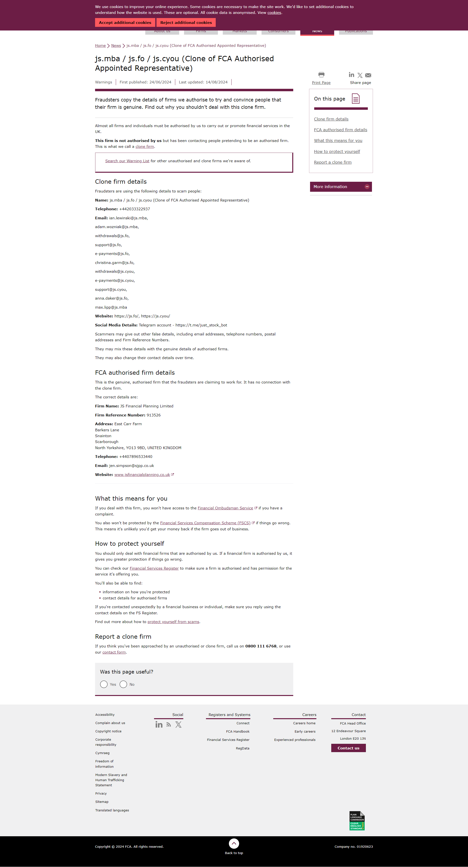 Daftar Peringatan FCA tentang perusahaan-perusahaan yang tidak berwenang js.mba / js.fo / js.cyou (Klon dari Perwakilan yang Ditunjuk yang Berwenang oleh FCA).