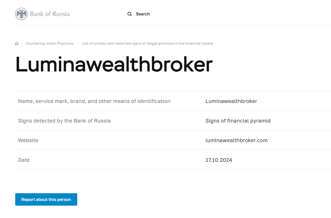 Nama, merek layanan, merek, dan cara identifikasi lainnya Luminawealthbroker Tanda-tanda yang terdeteksi oleh Bank Rusia Tanda-tanda piramida keuangan Situs web luminawealthbroker.com Tanggal 17.10.2024