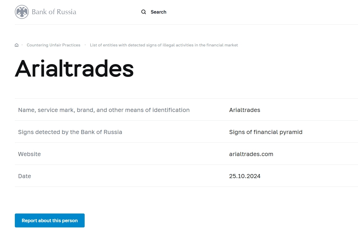 nama, merek layanan, merek, dan sarana identifikasi lainnya Arialtrades tanda-tanda terdeteksi oleh bank rusia tanda-tanda piramida keuangan situs web Arialtrades .com tanggal 25.10.2024