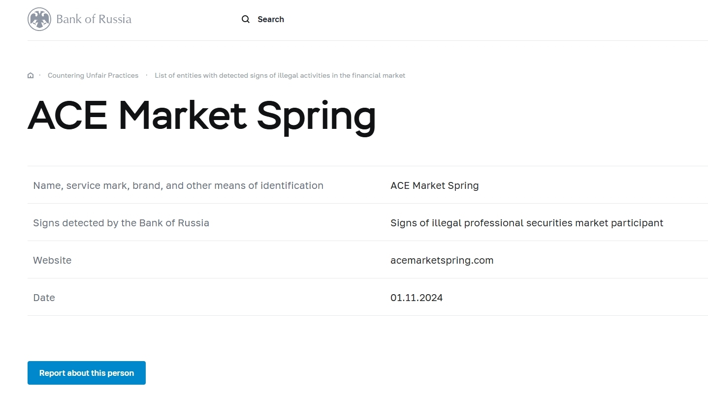 nama, merek layanan, merek, dan sarana identifikasi lainnya Ace Market Spring tanda-tanda terdeteksi oleh bank rusia tanda-tanda pelaku pasar sekuritas profesional ilegal situs web acemarketspring.com tanggal 01.11.2024