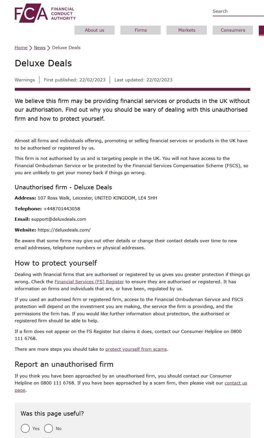 Bahasa Indonesia: Kami yakin firma ini mungkin menyediakan layanan atau produk keuangan di Inggris Raya tanpa otorisasi kami. Cari tahu mengapa Anda harus berhati-hati bertransaksi dengan firma yang tidak sah ini dan cara melindungi diri Anda sendiri. Hampir semua firma dan individu yang menawarkan, mempromosikan, atau menjual layanan atau produk keuangan di Inggris Raya harus disahkan atau didaftarkan oleh kami. Firma ini tidak disahkan oleh kami dan menargetkan orang-orang di Inggris Raya. Anda tidak akan memiliki akses ke Layanan Ombudsman Keuangan atau dilindungi oleh Skema Kompensasi Layanan Keuangan (FSCS), jadi kecil kemungkinan Anda akan mendapatkan uang Anda kembali jika terjadi kesalahan. Firma yang tidak sah - Deluxe Deals Alamat: 107 Ross Walk, Leicester, UNITED KINGDOM, LE4 5HH Telepon: +448701443058 Email: support@deluxdeals.com Situs web: https://deluxdeals.com/ Ketahuilah bahwa beberapa firma dapat memberikan detail lain atau mengubah detail kontak mereka dari waktu ke waktu ke alamat email, nomor telepon, atau alamat fisik baru. Cara melindungi diri Anda Bertransaksi dengan perusahaan keuangan yang disahkan atau terdaftar oleh kami memberi Anda perlindungan yang lebih besar jika terjadi kesalahan. Periksa Daftar Layanan Keuangan (FS) untuk memastikan mereka disahkan atau terdaftar. Daftar tersebut memiliki informasi tentang perusahaan dan individu yang diatur, atau pernah diatur oleh kami. Jika Anda menggunakan perusahaan yang disahkan atau perusahaan terdaftar, akses ke Layanan Ombudsman Keuangan dan perlindungan FSCS akan bergantung pada investasi yang Anda lakukan, layanan yang disediakan perusahaan, dan izin yang dimiliki perusahaan. Jika Anda menginginkan informasi lebih lanjut tentang perlindungan, perusahaan yang disahkan atau terdaftar seharusnya dapat membantu. Jika sebuah perusahaan tidak muncul di Daftar FS tetapi mengklaim demikian, hubungi Saluran Bantuan Konsumen kami di 0800 111 6768. Ada lebih banyak langkah yang harus Anda ambil untuk melindungi diri Anda dari penipuan.