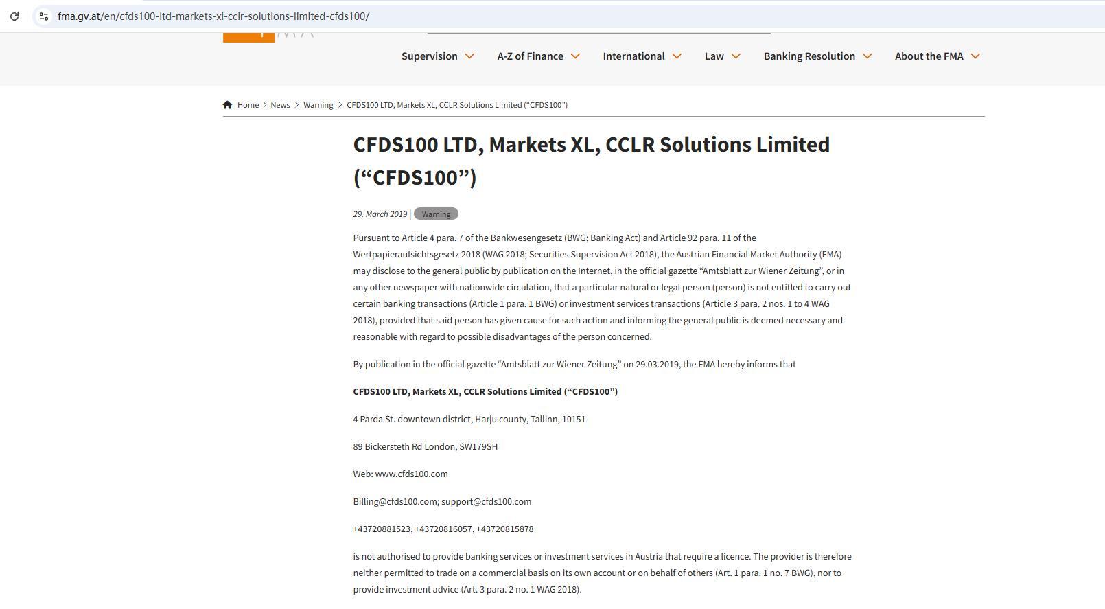 CFDS100ltd, pasar xl, cclr solutions limited (“ CFDS100 ") tanggal rilis:29 maret 2019 | kategori:peringatan sesuai dengan pasal 4 ayat 7 bankwesengesetz (bwg; undang-undang perbankan) dan pasal 92 ayat 11 wertpapieraufsichtsgesetz 2018 (wag 2018; undang-undang pengawasan sekuritas 2018), otoritas pasar keuangan austria (fma) dapat mengungkapkan kepada masyarakat umum melalui publikasi di internet, dalam lembaran resmi “amtsblatt zur wiener zeitung”, atau di surat kabar lain yang beredar secara nasional, bahwa orang atau badan hukum tertentu (orang) tidak berhak untuk melakukan transaksi perbankan tertentu (pasal 1 ayat 1 bwg) atau transaksi layanan investasi (pasal 3 ayat 2 nos. 1 sampai 4 wag 2018), dengan ketentuan bahwa orang tersebut telah memberikan alasan untuk tindakan tersebut dan menginformasikan kepada masyarakat umum dianggap perlu dan wajar sehubungan dengan kemungkinan kerugian yang dialami orang yang bersangkutan. melalui publikasi di lembaran resmi lembaran negara “amtsblatt zur wiener zeitung” pada tanggal 29.03.2019, dengan ini fma menginformasikan bahwa CFDS100 ltd, pasar xl, cclr solutions limited (“ CFDS100 ”) 4 parda st.pusat kota distrik, daerah harju, tallinn, 10151 89 bickersteth rd london, sw179sh web: www. CFDS100 penagihan .com@ CFDS100 .com; dukungan@ CFDS100 .com +43720881523, +43720816057, +43720815878 tidak berwenang menyediakan layanan perbankan atau layanan investasi di Austria yang memerlukan lisensi. Oleh karena itu, penyedia tidak diizinkan berdagang secara komersial untuk akunnya sendiri atau atas nama orang lain (pasal 1 ayat 1 no. 7 bwg), atau memberikan nasihat investasi (pasal 3 ayat 2 no. 1 wag 2018).