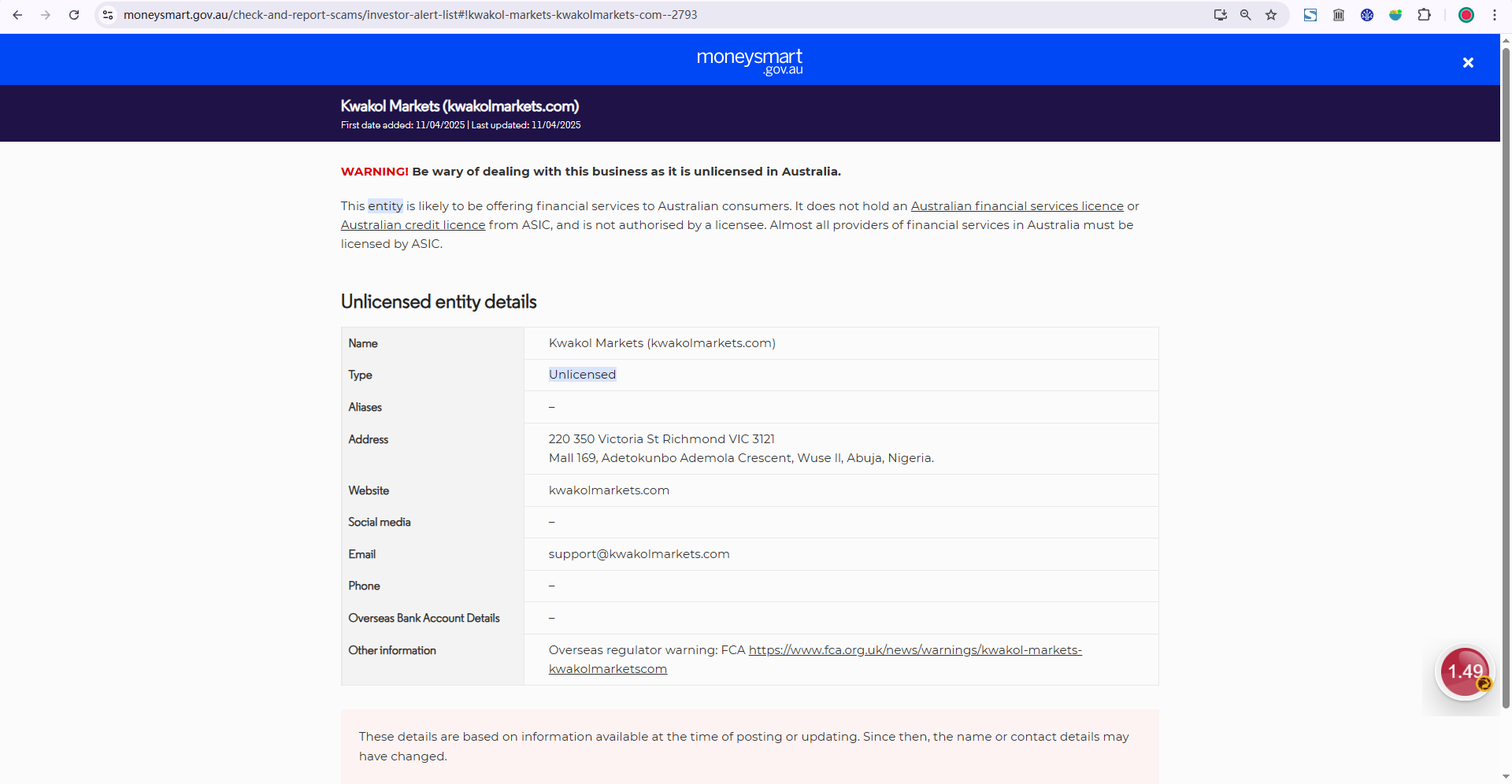 entitas ini kemungkinan besar menawarkan layanan keuangan kepada konsumen Australia. entitas ini tidak memegang lisensi layanan keuangan Australia atau lisensi kredit Australia dari ASIC, dan tidak diberi wewenang oleh pemegang lisensi. hampir semua penyedia layanan keuangan di Australia harus memiliki lisensi dari ASIC. detail entitas tanpa lisensi nama Kwakol Markets (kwakolmarkets.com) ketik alias tanpa lisensi – alamat 220 350 victoria st richmond vic 3121 mall 169, adetokunbo ademola crescent, wuse ll, abuja, nigeria. situs web kwakolmarkets.com media sosial – email support@kwakolmarkets.com telepon – detail rekening bank luar negeri – informasi lainnya peringatan regulator luar negeri: fca https://www.fca.org.uk/news/warnings/kwakol-markets-kwakolmarketscom
