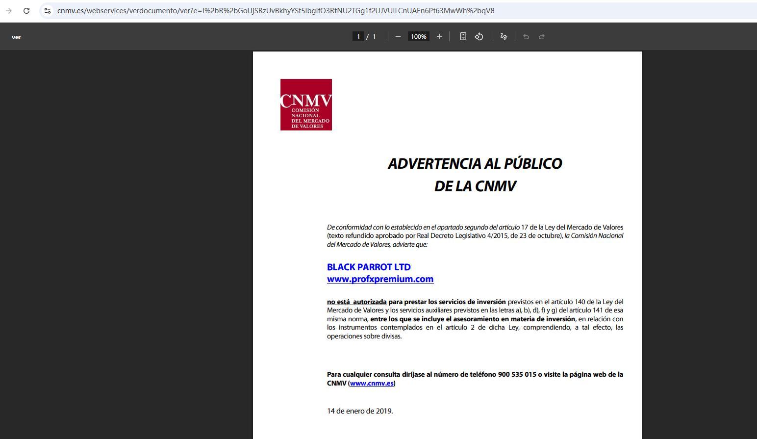PERINGATAN UNTUK PUBLIK DARI CNMV Sesuai dengan ketentuan yang ditetapkan dalam bagian kedua Pasal 17 Undang-Undang Pasar Modal (teks yang disatukan disetujui oleh Keputusan Kerajaan Legislatif 4/2015, tanggal 23 Oktober), Komisi Nasional Pasar Modal, memperingatkan bahwa: BLACK PARROT LTD www.profxpremium.com tidak diizinkan untuk memberikan layanan investasi yang diatur dalam Pasal 140 Undang-Undang Pasar Modal dan layanan pendukung yang diatur dalam huruf a), b), d), f), dan g) Pasal 141 dari peraturan yang sama, termasuk di dalamnya nasihat investasi, terkait instrumen yang tercantum dalam Pasal 2 Undang-Undang tersebut, mencakup, untuk tujuan ini, operasi valuta asing. Untuk pertanyaan lebih lanjut, hubungi nomor telepon 900 535 015 atau kunjungi situs web CNMV (www.cnmv.es) 14 Januari 2019..