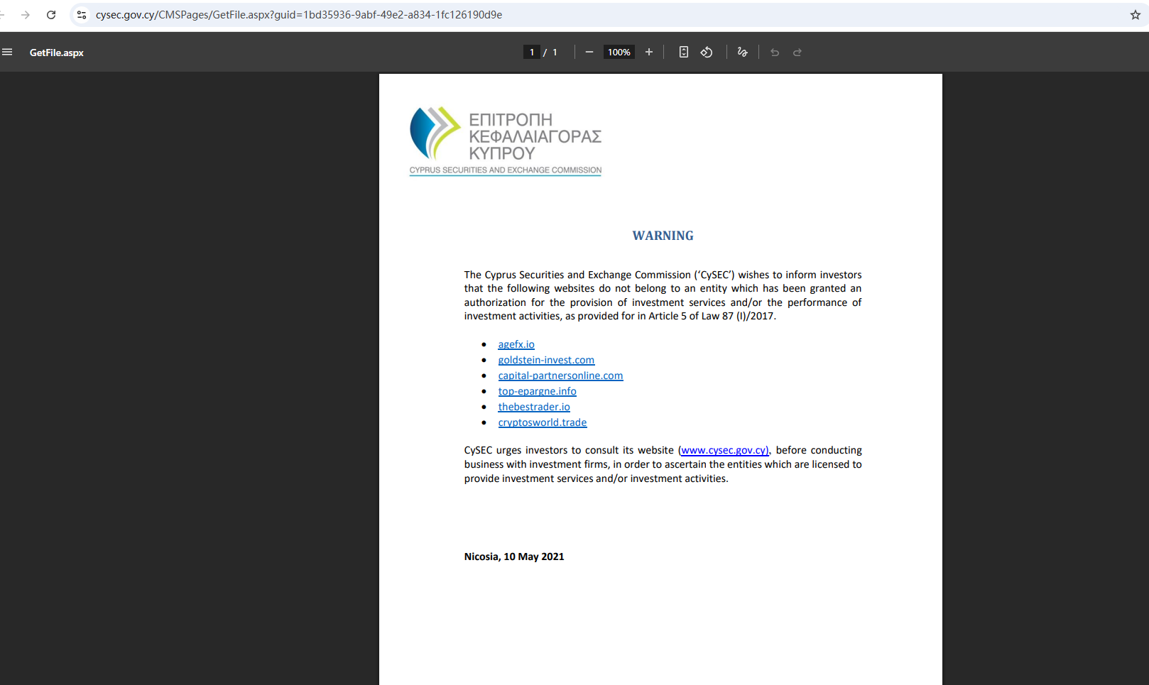 Komisi Sekuritas dan Bursa Siprus (‘CySEC’) ingin menginformasikan kepada investor bahwa situs web berikut bukan milik entitas yang telah diberikan otorisasi untuk penyediaan layanan investasi dan/atau pelaksanaan kegiatan investasi, sebagaimana diatur dalam Pasal 5 Undang-Undang 87 (I)/2017.  agefx.io  goldstein-invest.com  capital-partnersonline.com  top-epargne.info  thebestrader.io  cryptosworld.trade CySEC mengimbau investor untuk mengunjungi situs webnya (www.cysec.gov.cy), sebelum berbisnis dengan perusahaan investasi, guna memastikan entitas yang memiliki izin untuk menyediakan layanan investasi dan/atau kegiatan investasi. Nikosia, 10 Mei 2021