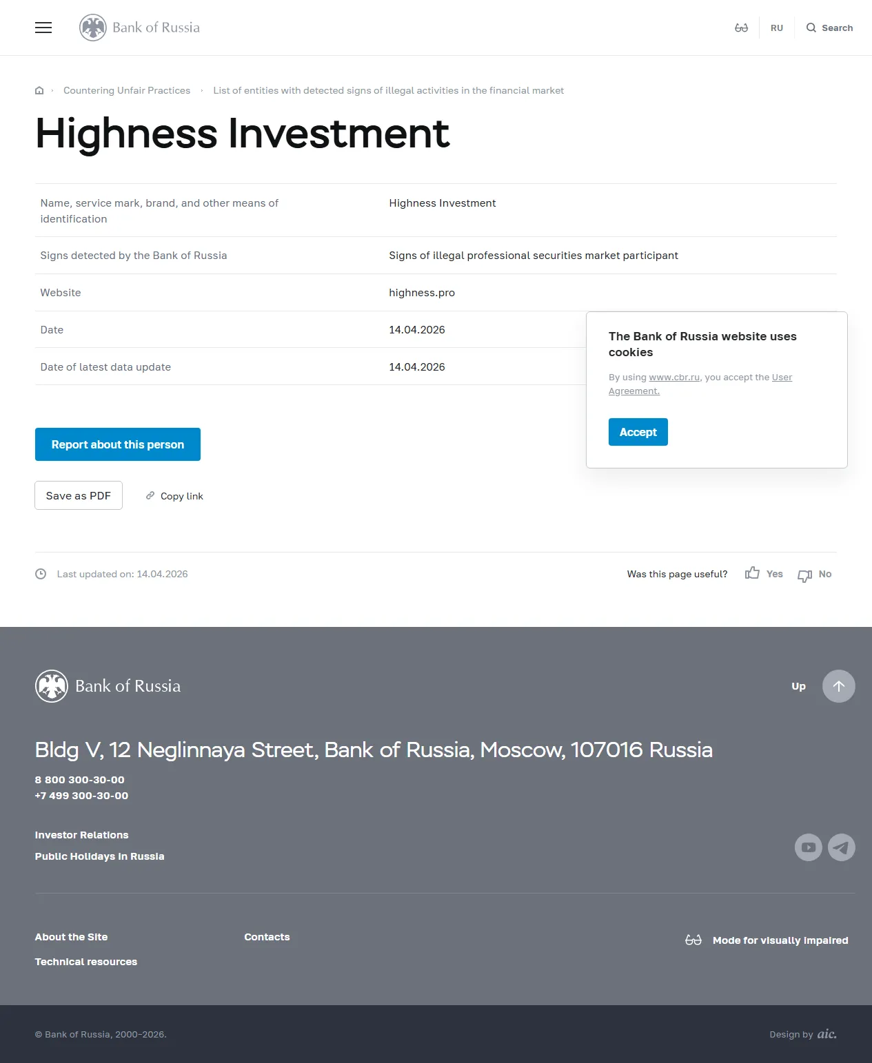 Nama, merek layanan, merek dagang, dan sarana identifikasi lainnya Highness Investment Tanda-tanda yang terdeteksi oleh Bank Rusia Tanda-tanda peserta pasar sekuritas profesional ilegal Situs web highness.pro Tanggal 14.04.2026 Tanggal pembaruan data terbaru 14.04.2026.