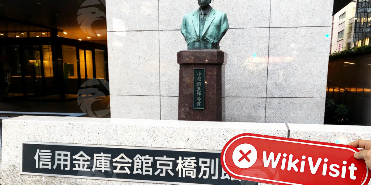 Surveyor melihat kata-kata "Bank Sentral Shinkin" digantung direktori di satu sisi fasad bangunan.