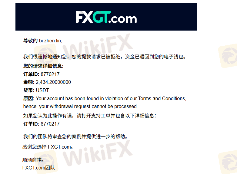 Saya adalah pengguna terdaftar dari platform FXGT Anda, akun saya adalah: [448639]. Saya telah lama menjadi pengguna setia platform Anda, selalu mematuhi aturan. Keluhan ini terutama ditujukan terhadap dua masalah serius yang terkait: Pertama, platform secara tidak masuk akal menolak permintaan penarikan legal saya tanpa penjelasan atau bukti yang masuk akal. Asal dana sepenuhnya legal dan sesuai aturan. Namun, setelah mengajukan permintaan penarikan, dana tidak ditransfer tepat waktu seperti sebelumnya, tetapi ditolak oleh platform. Saya segera menghubungi layanan pelanggan online untuk alasan penolakan, dan tanggapan mereka hanya sekadar, mengklaim pelanggaran syarat dan ketentuan. Ketika saya meminta layanan pelanggan untuk menjelaskan: 1. Aturan platform mana yang dilanggar? 2. Apa yang dimaksud dengan pelanggaran tersebut? Tolong berikan bukti yang kuat. Untuk masalah kritis di atas, layanan pelanggan tidak dapat memberikan jawaban langsung dan spesifik, tetapi menghindari masalah dengan mengatakan "ini adalah penilaian sistem, kami tidak dapat campur tangan\". Penolakan tanpa dasar ini pada dasarnya merupakan pelanggaran yang tidak masuk akal terhadap hak properti hukum saya oleh platform. Kedua, platform secara sepihak dan paksa mengembalikan izin login akun saya, mencoba \"menangani dingin" masalah tanpa menyelesaikan masalah penarikan. Setelah penarikan ditolak, akun saya sementara tidak dapat login atau fungsinya dibatasi. Tetapi yang membuat marah adalah platform secara sepihak menutup izin login akun saya tanpa komunikasi apa pun dan tanpa solusi untuk masalah penarikan. Tuntutan saya adalah: 1. Pencairan dana segera: Menuntut 1. Platform untuk segera mencabut pembekuan dana (1957.11) di akun saya, dan menyelesaikan operasi penarikan, memungkinkan dana berhasil mencapai akun yang terikat saya. 2. Berikan penjelasan tertulis: Minta platform untuk memberikan penjelasan tertulis yang resmi dan dapat dipercaya untuk insiden "penolakan penarikan yang tidak masuk akal\" dan \"kontrol akun yang tidak normal" ini, menjelaskan secara spesifik dan alasan sebenarnya untuk penentuan awal ketidaknormalan akun. 3. Permintaan maaf resmi: Mengharuskan platform untuk meminta maaf secara resmi atas biaya waktu, tekanan mental, dan kerusakan hak yang disebabkan oleh insiden ini. Insiden ini telah sangat merusak kepercayaan saya pada platform Anda, dan telah membuat saya sangat meragukan mekanisme keamanan dana dan perlindungan hak pengguna platform Anda. Saya harus mengambil langkah-langkah berikut untuk melindungi hak saya: • Melaporkan ke Administrasi Pengawasan Pasar Negara, Asosiasi Keuangan Internet China, dan departemen terkait lainnya. • Mengekspos masalah ini melalui Asosiasi Konsumen, media, dan saluran lainnya. Saya menantikan penanganan serius dan balasan cepat dari Anda.