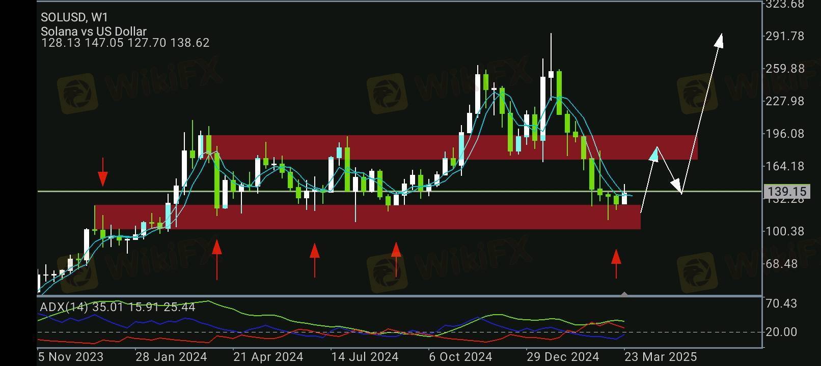 Level support utama berada di sekitar $132 - $140, yang telah diuji beberapa kali di masa lalu (ditandai dengan panah merah).