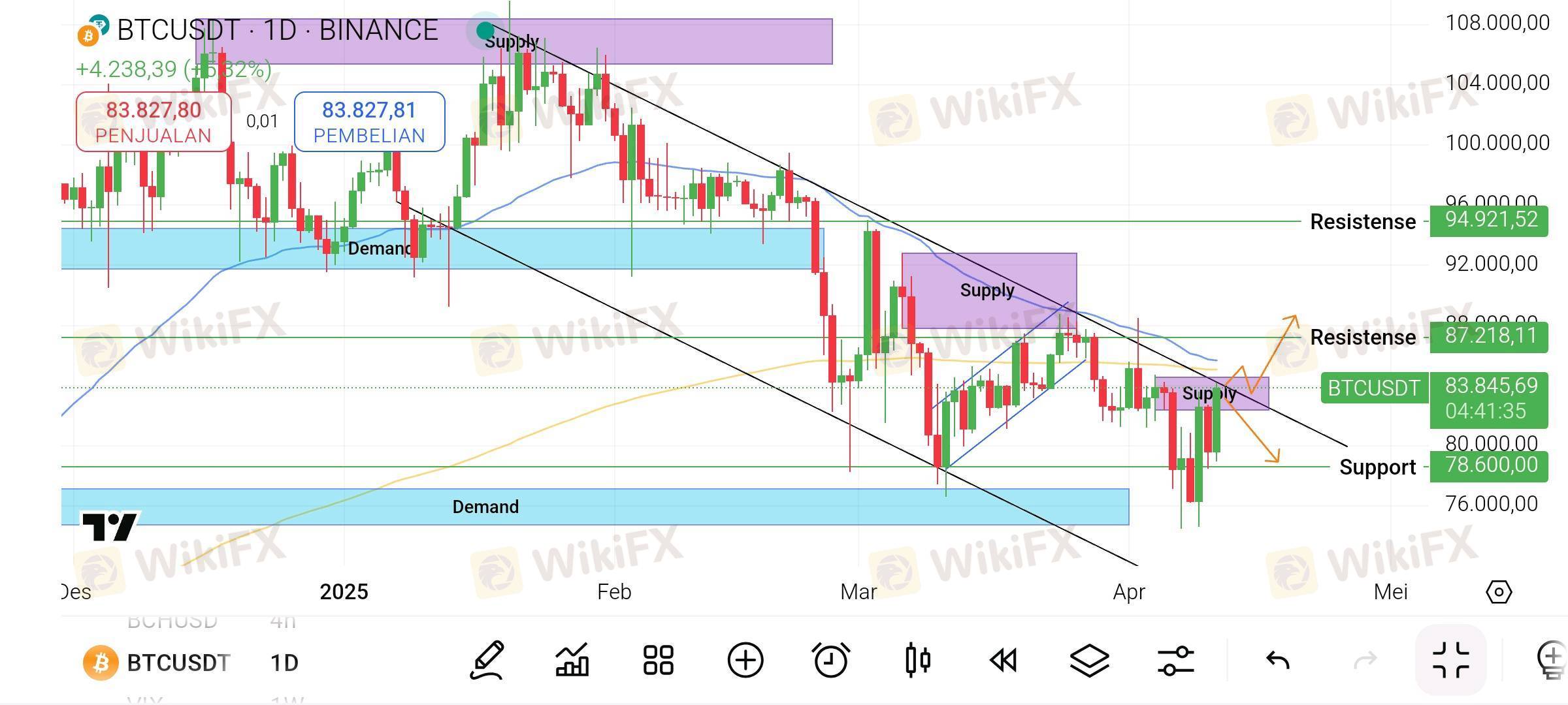 Jika harga berhasil menembus zona supply di 85.000–87.000 dan menutup di atas, ada potensi rally menuju 94.900+.
