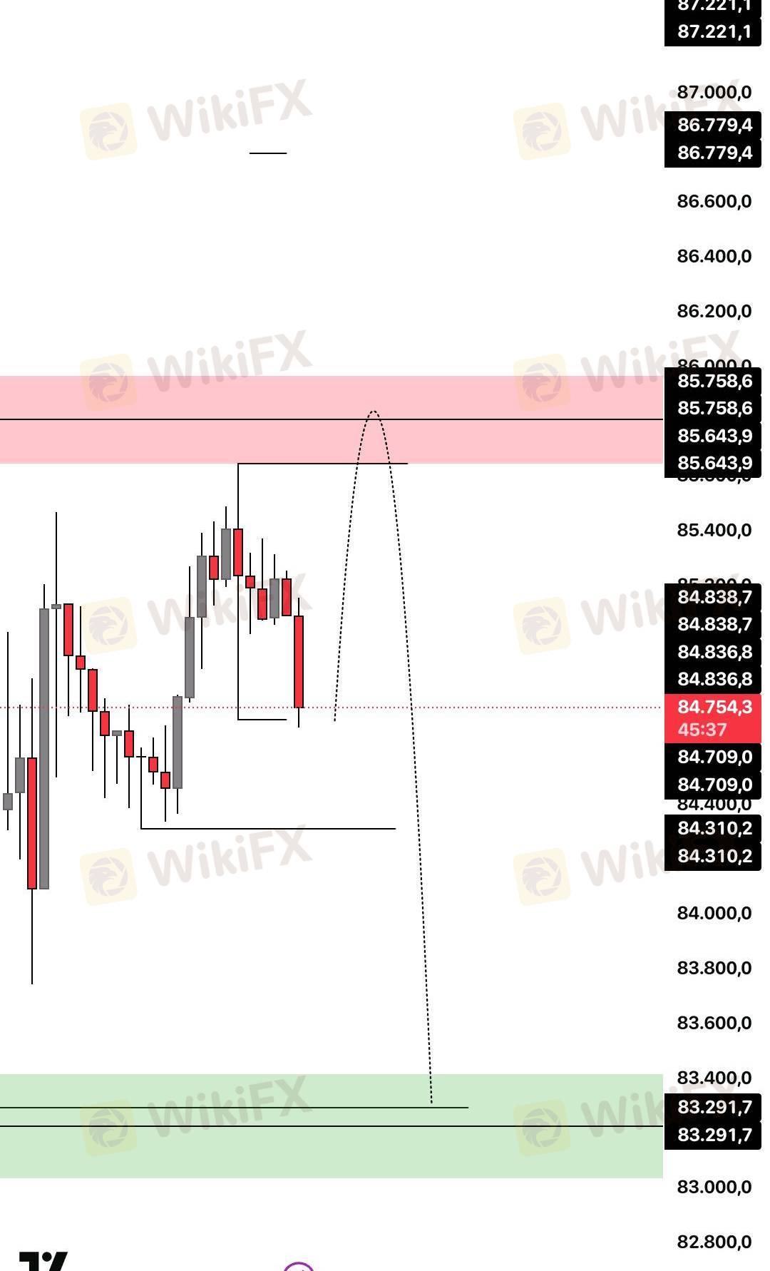 Konfirmasi bearish: Close di bawah 85,300 (level akses pendek).