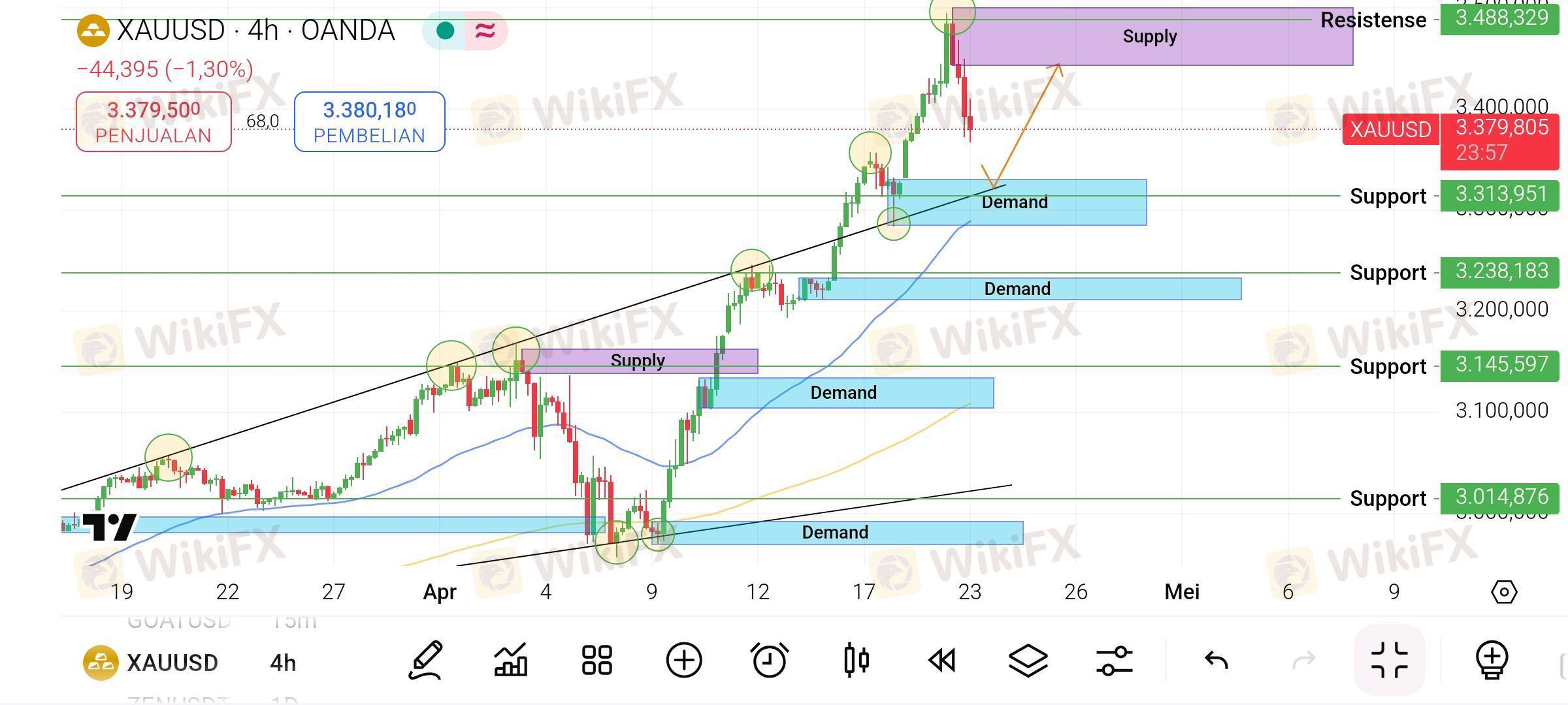 Supply Terdekat: Sekitar level 3.488.329 — harga telah menyentuh dan mulai terkoreksi dari area ini.