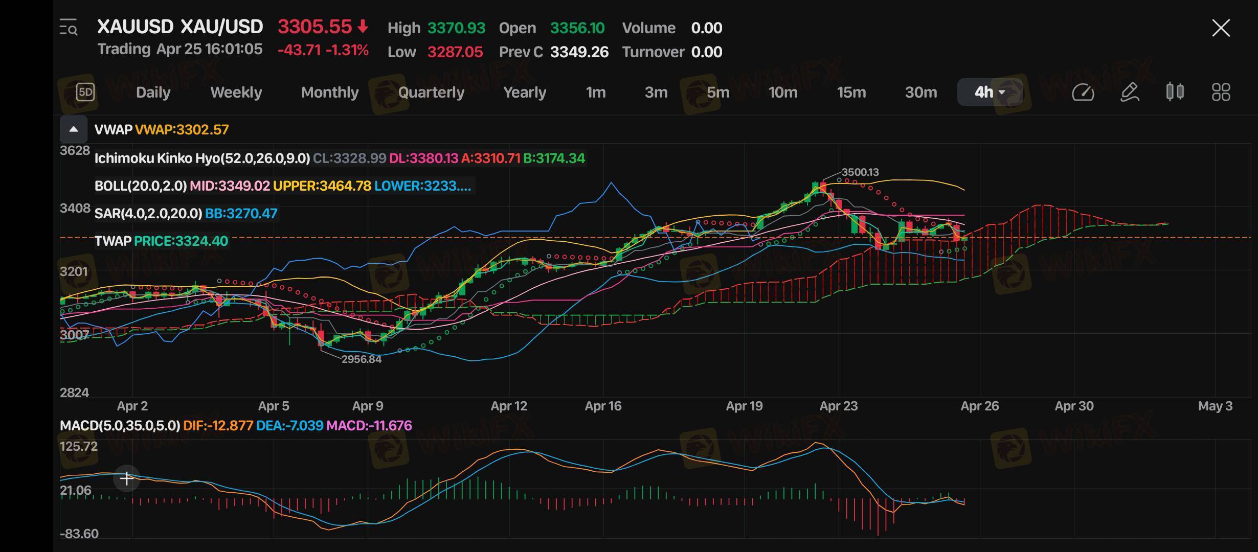 Harga emas (XAU/USD) saat ini berada di kisaran $3.305,55, mengalami penurunan -1,31% pada sesi hari ini. Analisis teknikal menunjukkan adanya konsolidasi setelah koreksi tajam dari level tertinggi, dengan tekanan jual masih terasa namun mulai muncul sinyal potensi rebound menjelang penutupan pasar malam ini.