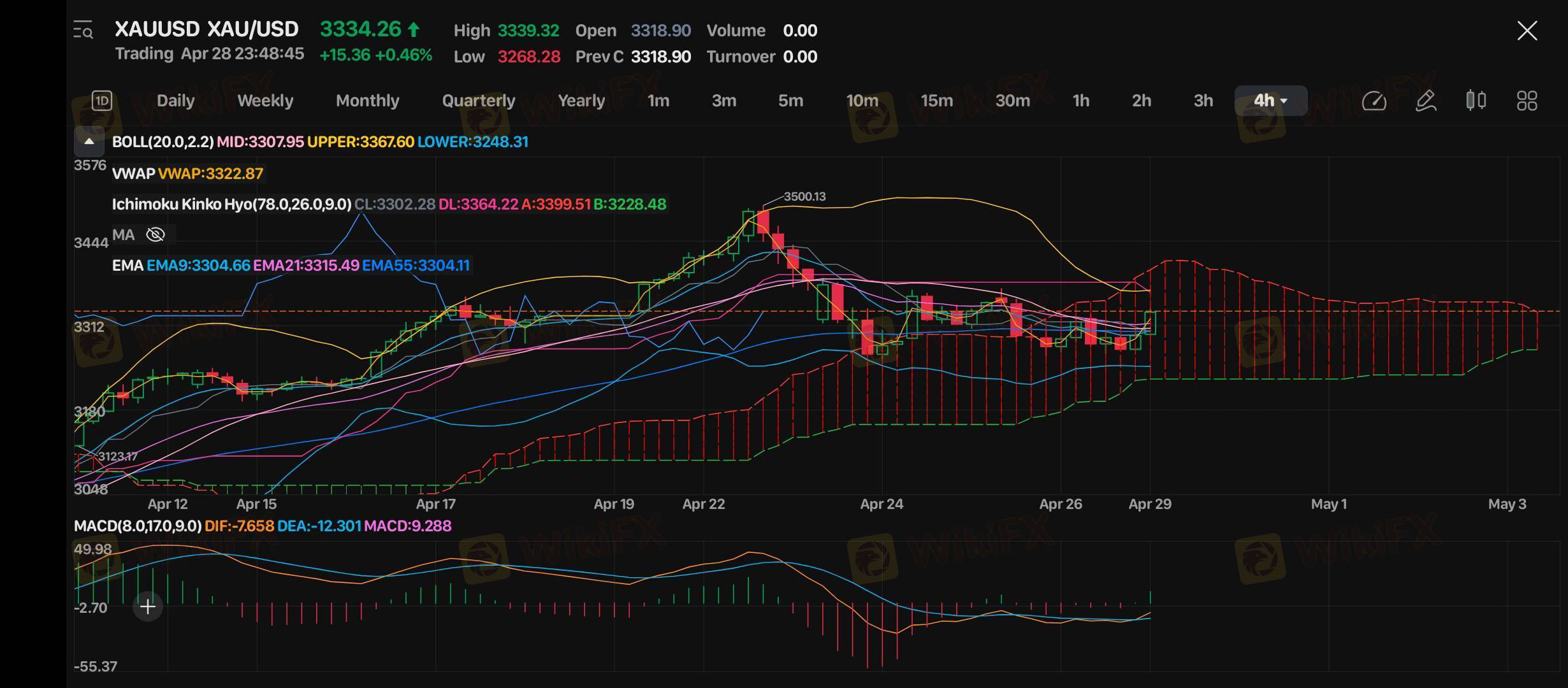 Target penembusan sebelum jam 12:00 (29 April 2025) adalah 3367.60 (upper Bollinger Band). Jika harga menembus level ini dengan volume tinggi, arah market cenderung bullish menuju 3399.51 (resistensi Ichimoku). Sebaliknya, jika gagal, harga bisa turun ke 3328.48 (support Ichimoku).