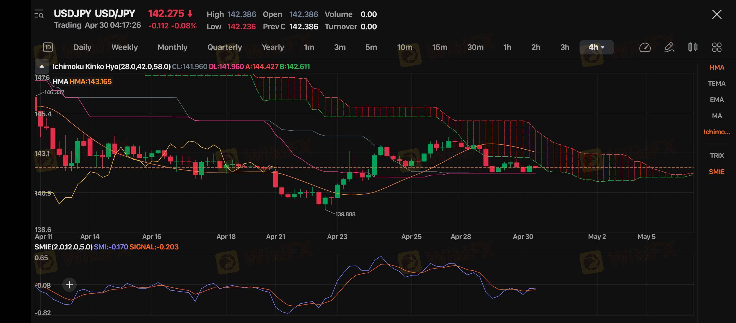 Pada grafik 4 jam USD/JPY, harga saat ini berada di level 142.275 dengan tren sideways yang cenderung melemah. Harga masih berada di bawah awan Ichimoku yang berwarna merah, menandakan tekanan bearish yang masih dominan. HMA berada di level 143.165, di atas harga saat ini, berfungsi sebagai resistance dinamis. Indikator SMIE menunjukkan sinyal negatif yang mengindikasikan momentum bearish masih berpotensi berlanjut.