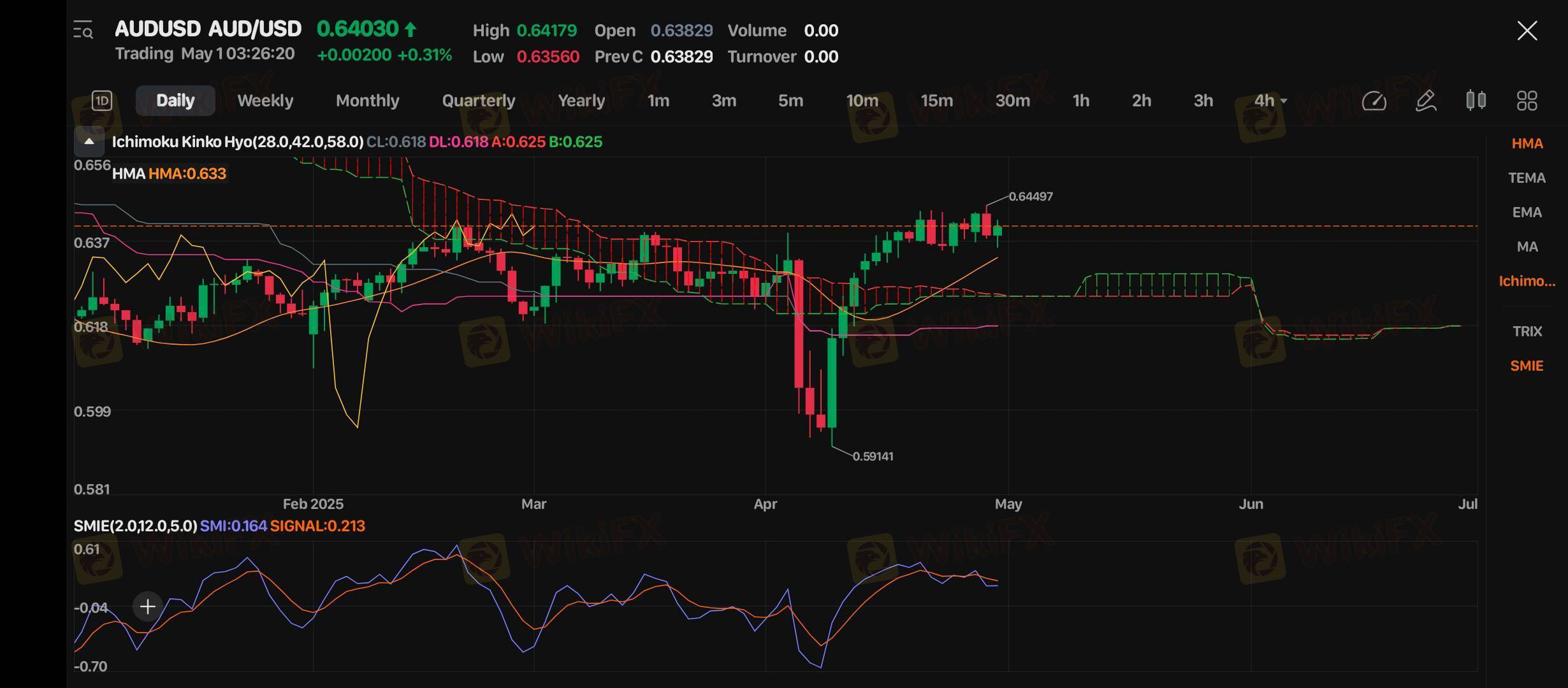 AUD/USD saat ini berada di level 0.64030, mengalami kenaikan +0.31% sejak pembukaan sesi perdagangan hari ini. Chart daily menunjukkan pola sideways dengan potensi bullish continuation, dengan harga terjebak dalam channel sempit antara 0.6350–0.6450. Indikator teknis seperti Ichimoku Kinko Hyo dan HMA (Hull Moving Average) memberikan sinyal bahwa sentimen bullish masih kuat.