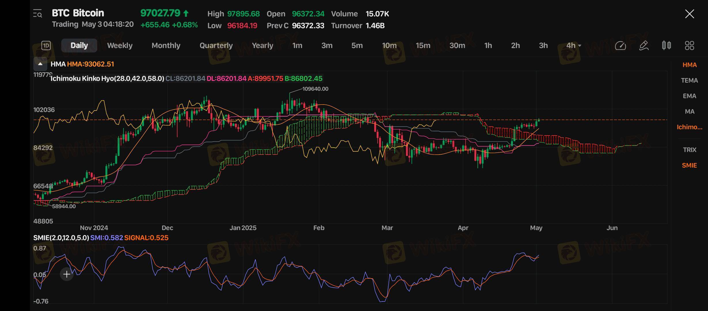 BTC/USD menunjukkan struktur bullish yang sangat kuat di timeframe daily. Breakout di atas awan Ichimoku dan HMA, didukung momentum SMI, membuka peluang rally ke 99k