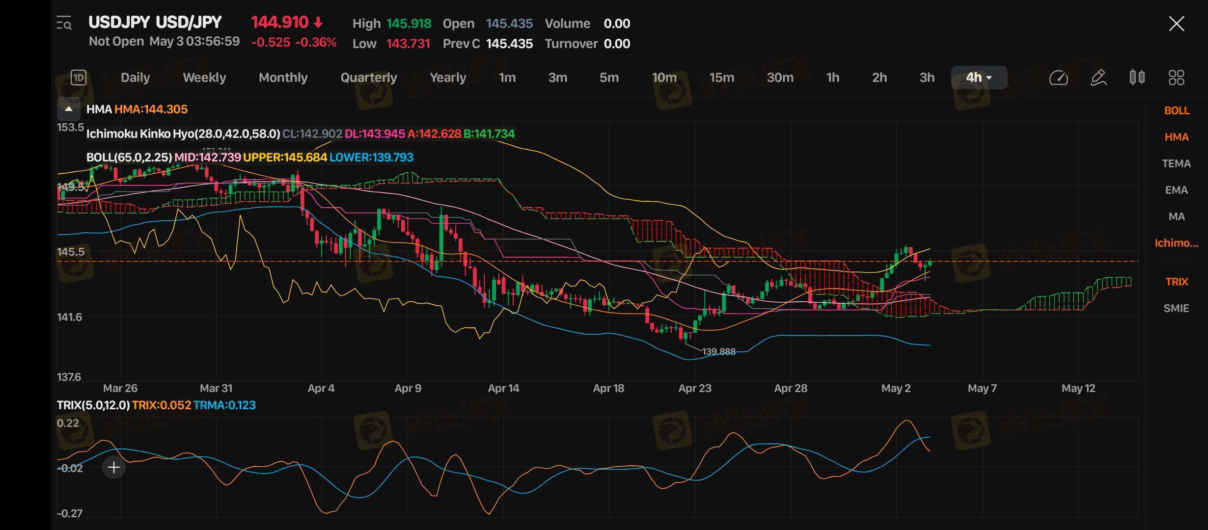 USD/JPY saat ini di level 144.910 dengan pola log-periodik yang jelas menunjukkan konsolidasi menjelang potensi breakout. Indikator Ichimoku Kinko Hyo(26,0.42,0.58,0) menampilkan sinyal bullish dengan harga berada di atas cloud, sementara TRIX(5,0.12) pada 0.052 dengan TRMA(0.123) mendukung momentum naik. Formasi candle terbaru menunjukkan akumulasi di dekat resistance log-periodik utama di 145.684.