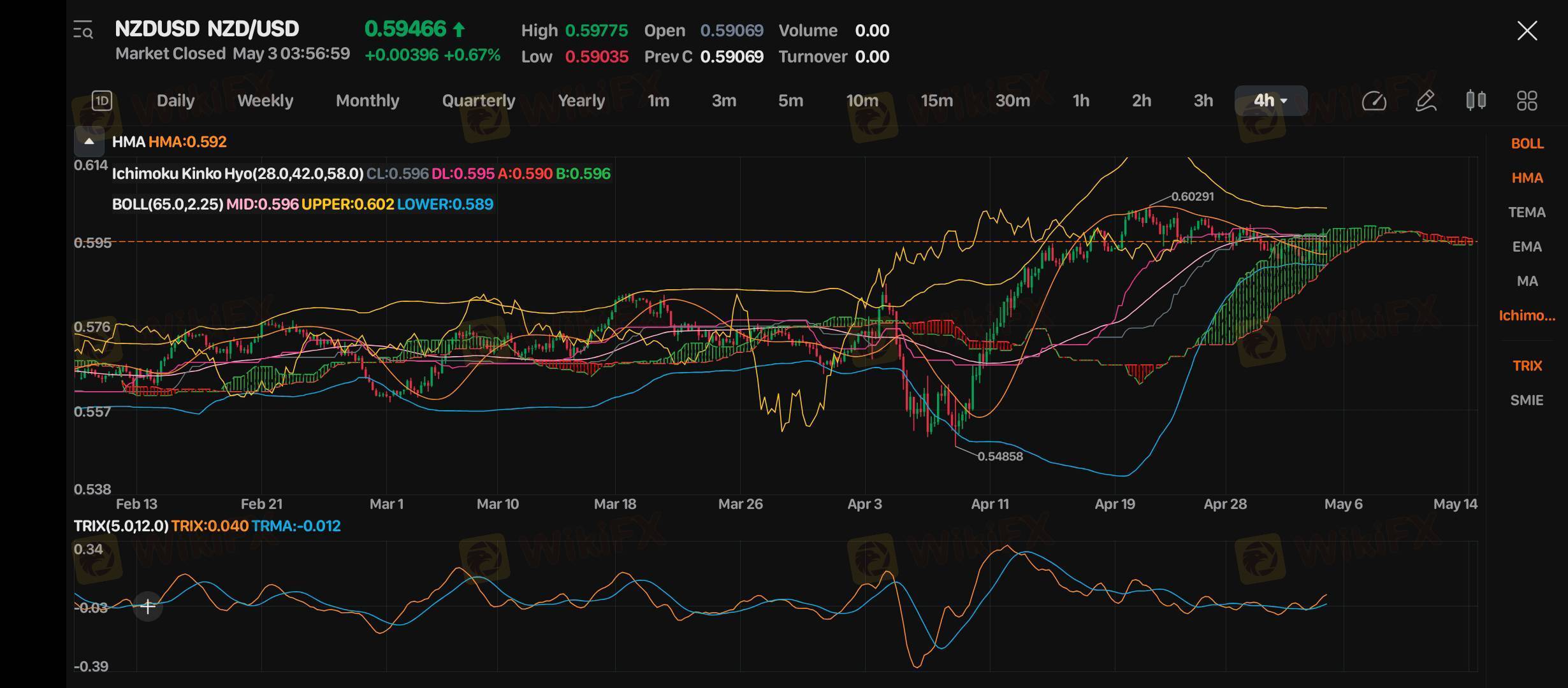 NZD/USD saat ini diperdagangkan di level 0.59466 (+0.00396, +0.67%), menunjukkan momentum bullish yang semakin menguat setelah recovery signifikan dari level 0.5846 (April). Indikator Log-Periodic Channels menampilkan pola kanal naik dengan batas atas di 0.602 dan batas bawah di 0.589. Ichimoku Kinko Hyo(26,0.42,0.58,0) memberikan sinyal bullish dengan CL:0.596 DL:0.595 A:0.590 B:0.596, dengan harga berada di atas cloud dan bergerak naik.