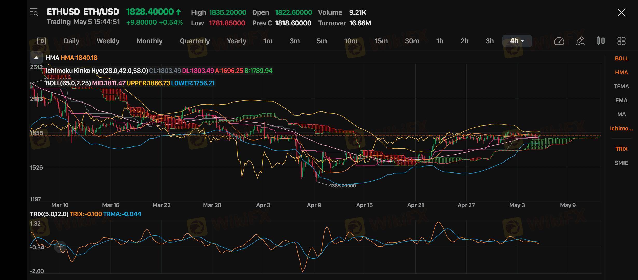 Ethereum saat ini diperdagangkan di level 1,828.40 (+9.80, +0.54%), menunjukkan momentum bullish yang makin menguat setelah konsolidasi panjang. Indikator Log-Periodic Channels mengidentifikasi pergerakan dalam kanal dengan batas atas di 1,866.73 dan batas bawah di 1,756.21. Ichimoku Kinko Hyo(26,0.42,0.58,0) memberikan sinyal bullish dengan CL:1803.49 DL:1803.49 A:1696.25 B:1789.94, dengan harga berada di atas cloud dan menunjukkan struktur teknikal yang menguat.
