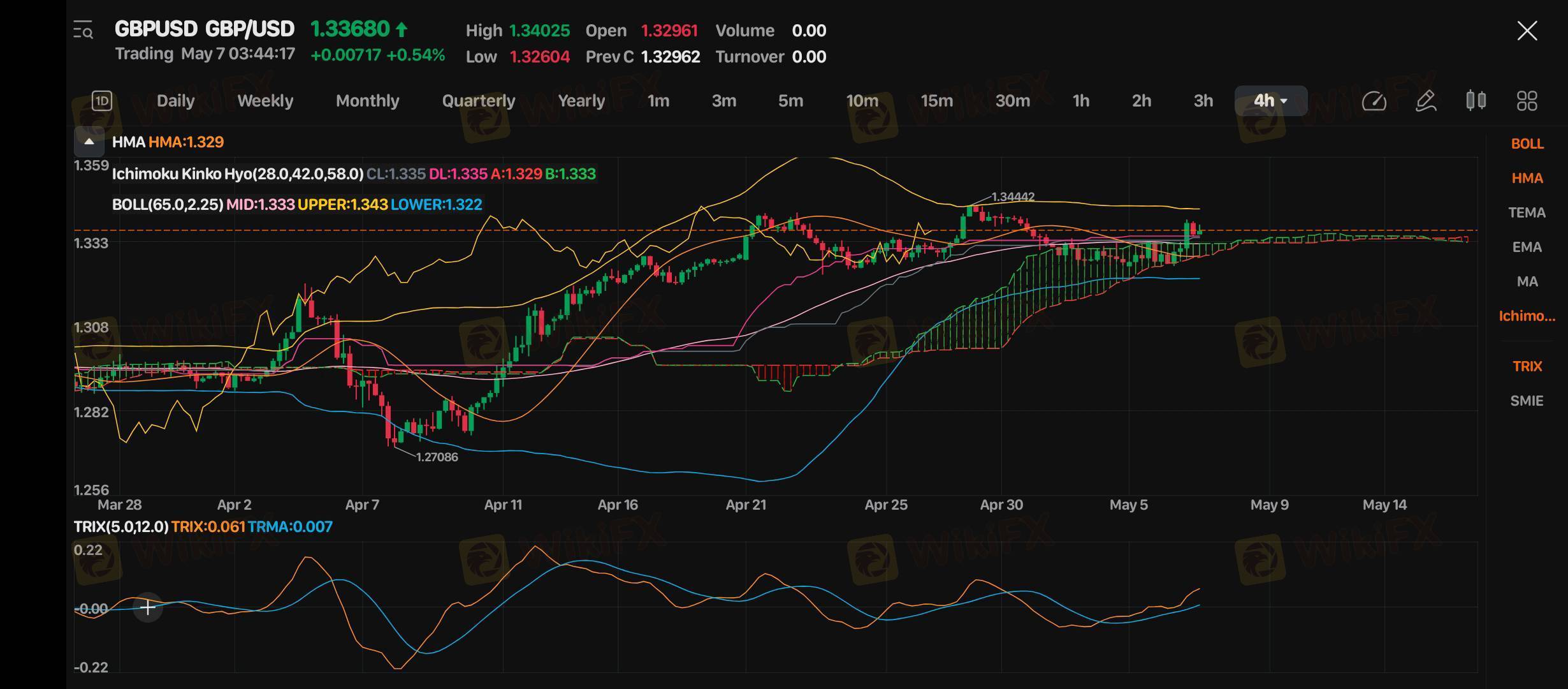 GBP/USD saat ini diperdagangkan pada level 1.3368 dengan kenaikan moderat (+0.54% atau +0.00717 poin). Analisis chart 4H menunjukkan trend bullish yang solid dengan harga bergerak di atas semua level EMA utama, mengkonfirmasi kekuatan penuh pada uptrend.