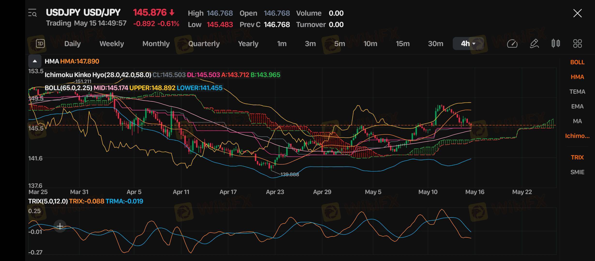 Harga di bawah HMA (147.890), menandakan bearish jangka pendek.