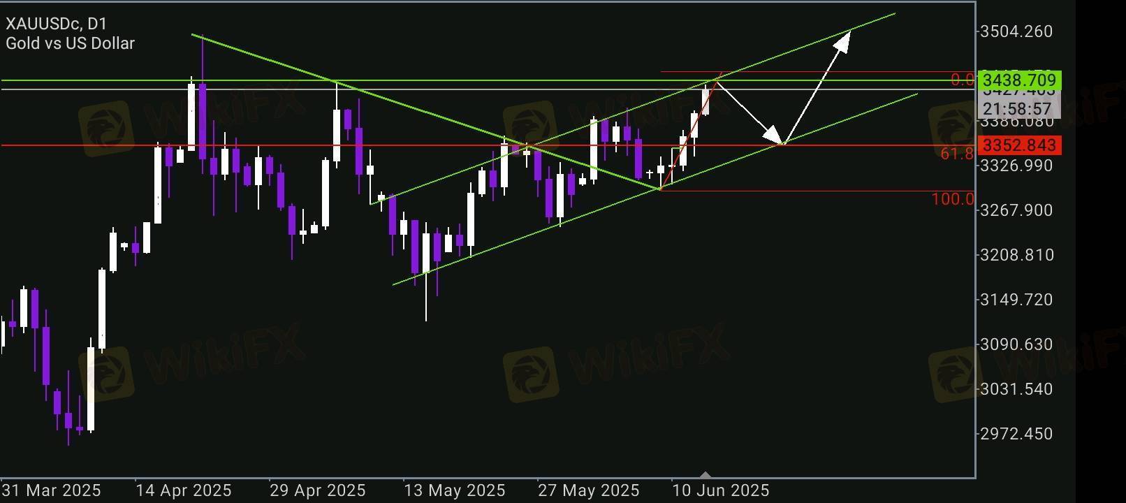 Harga emas (XAU/USD) saat ini bergerak dalam pola rising channel, mengindikasikan tren naik jangka menengah masih valid. Harga kini menguji resistance kunci di sekitar level 3438, yang juga merupakan area Fibonacci 0.0% retracement.