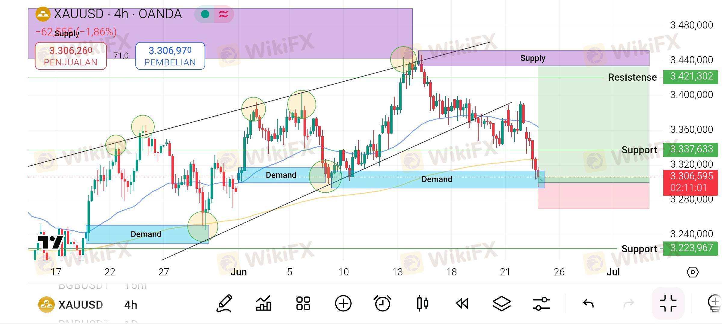 Harga breakdown dari zona demand di area sekitar 3.337.633, mengonfirmasi tekanan jual yang kuat.