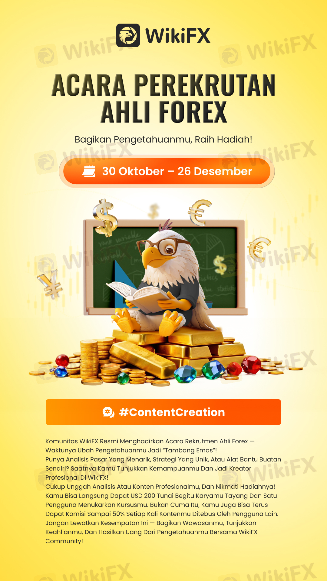 Komunitas WikiFX resmi menghadirkan Acara Rekrutmen Ahli Forex — waktunya ubah pengetahuanmu jadi “Tambang Emas”!Punya analisis pasar yang menarik, strategi yang unik, atau alat bantu buatan sendiri? Saatnya kamu tunjukkan kemampuanmu dan jadi kreator profesional di WikiFX!Cukup unggah analisis atau konten profesionalmu, dan nikmati hadiahnya! Kamu bisa langsung dapat USD 200 tunai begitu karyamu tayang dan satu pengguna menukarkan kursusmu. Bukan cuma itu, kamu juga bisa terus dapat komisi sampai 50% setiap kali kontenmu ditebus oleh pengguna lain.Jangan lewatkan kesempatan ini — bagikan wawasanmu, tunjukkan keahlianmu, dan hasilkan uang dari pengetahuanmu bersama WikiFX Community!