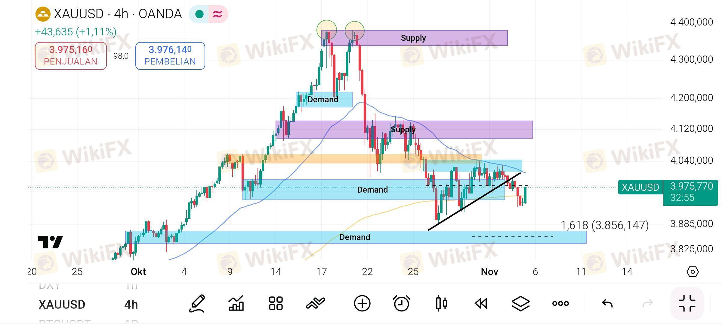 Pola Reversal (Double Top): Di bagian atas chart (sekitar level 4.400.000), harga tampak membentuk pola Double Top (ditandai dengan dua lingkaran kuning). Ini adalah pola reversal bearish klasik yang mengindikasikan bahwa tren naik yang kuat telah kehabisan tenaga dan kemungkinan akan berbalik arah.