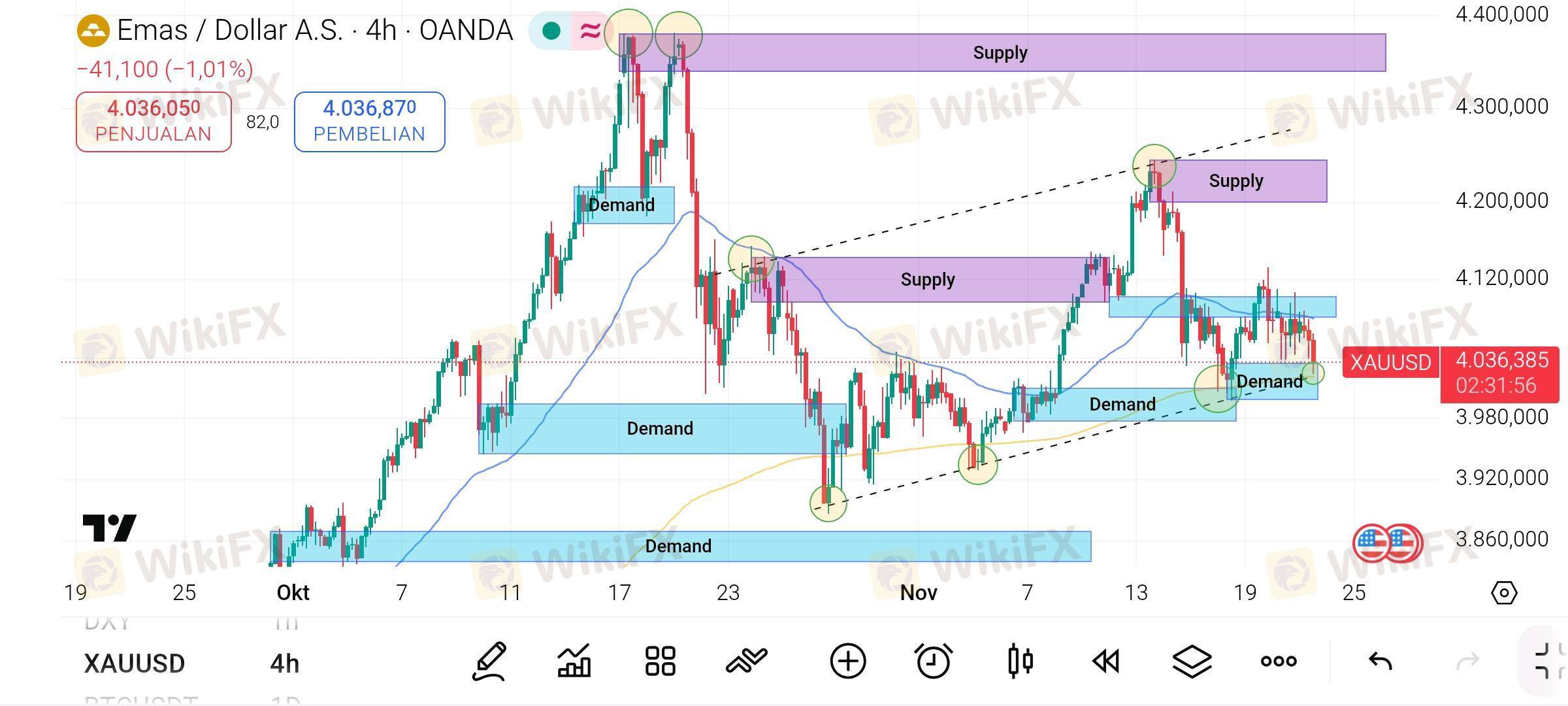 Zona Harga: Harga saat ini berada tepat di dalam zona Demand yang terbentuk di sekitar level 4,000 hingga 4,060 (perkiraan).